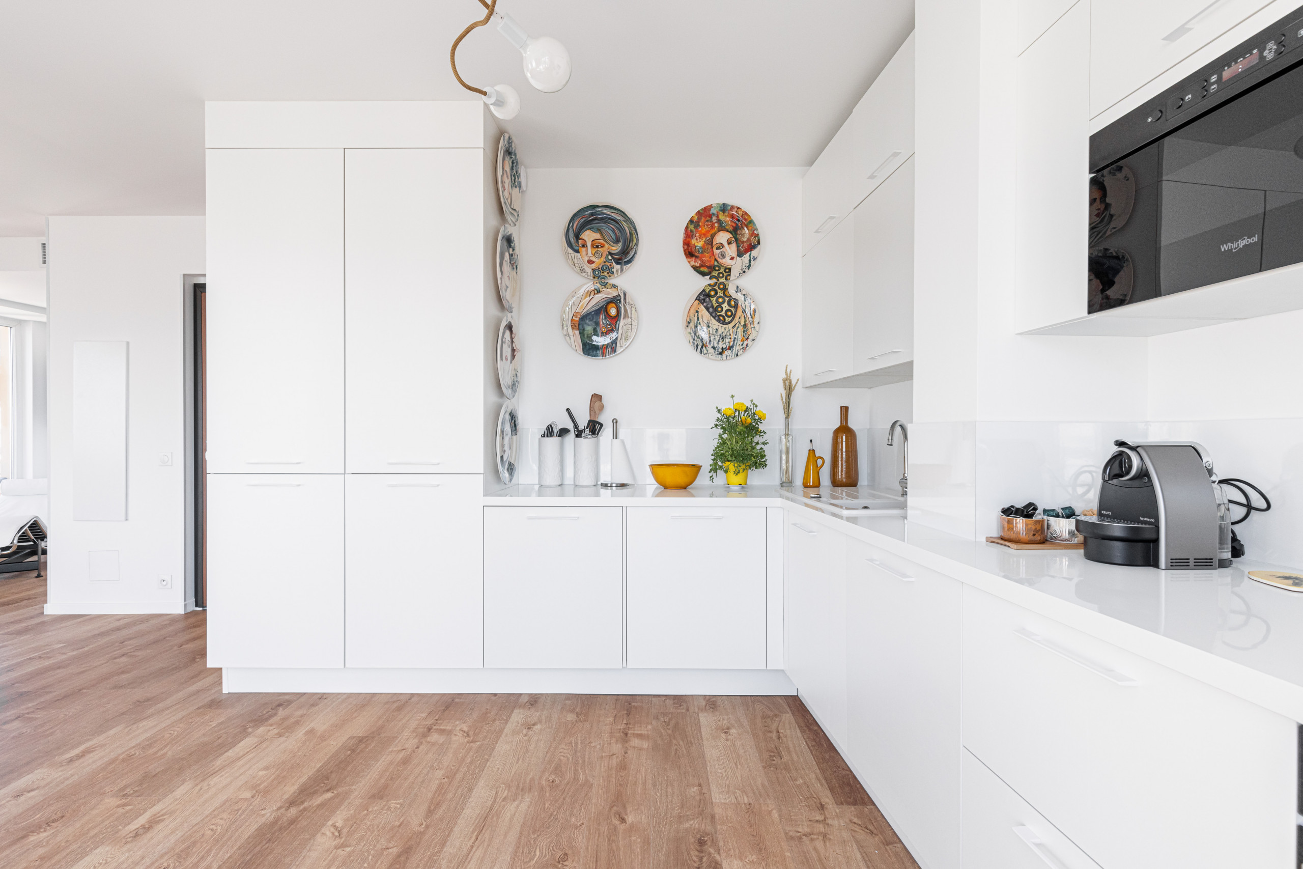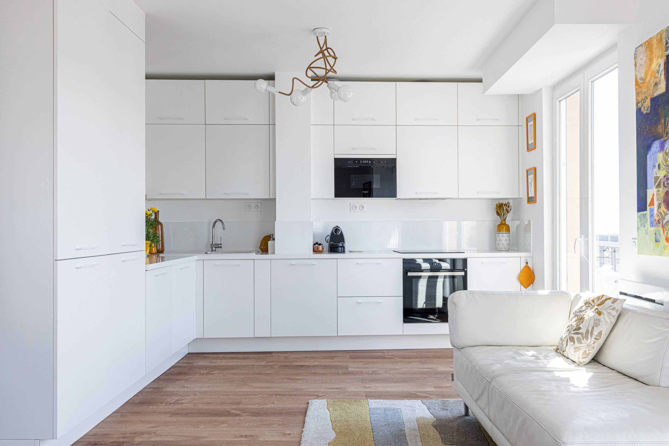 - une cuisine ouverte toute équipée : four, micro-ondes, lave-vaisselle, lave-linge, plaques de cuisson, machine à café Nespresso, réfrigérateur et congélateur, grille-pain, bouilloire, ustensiles de cuisine...