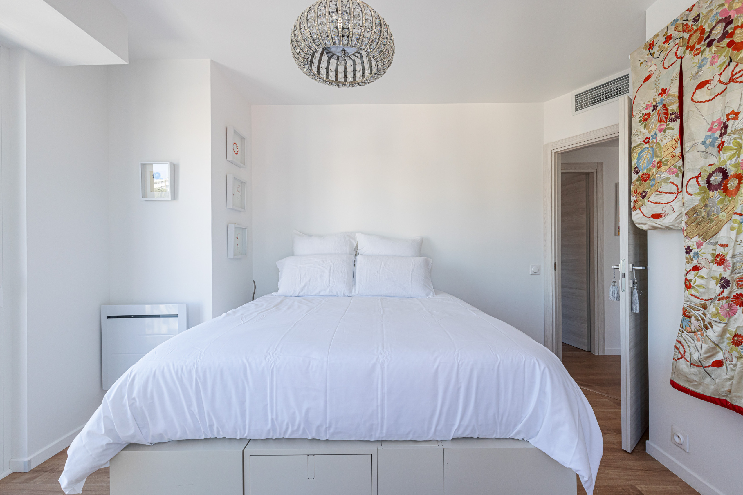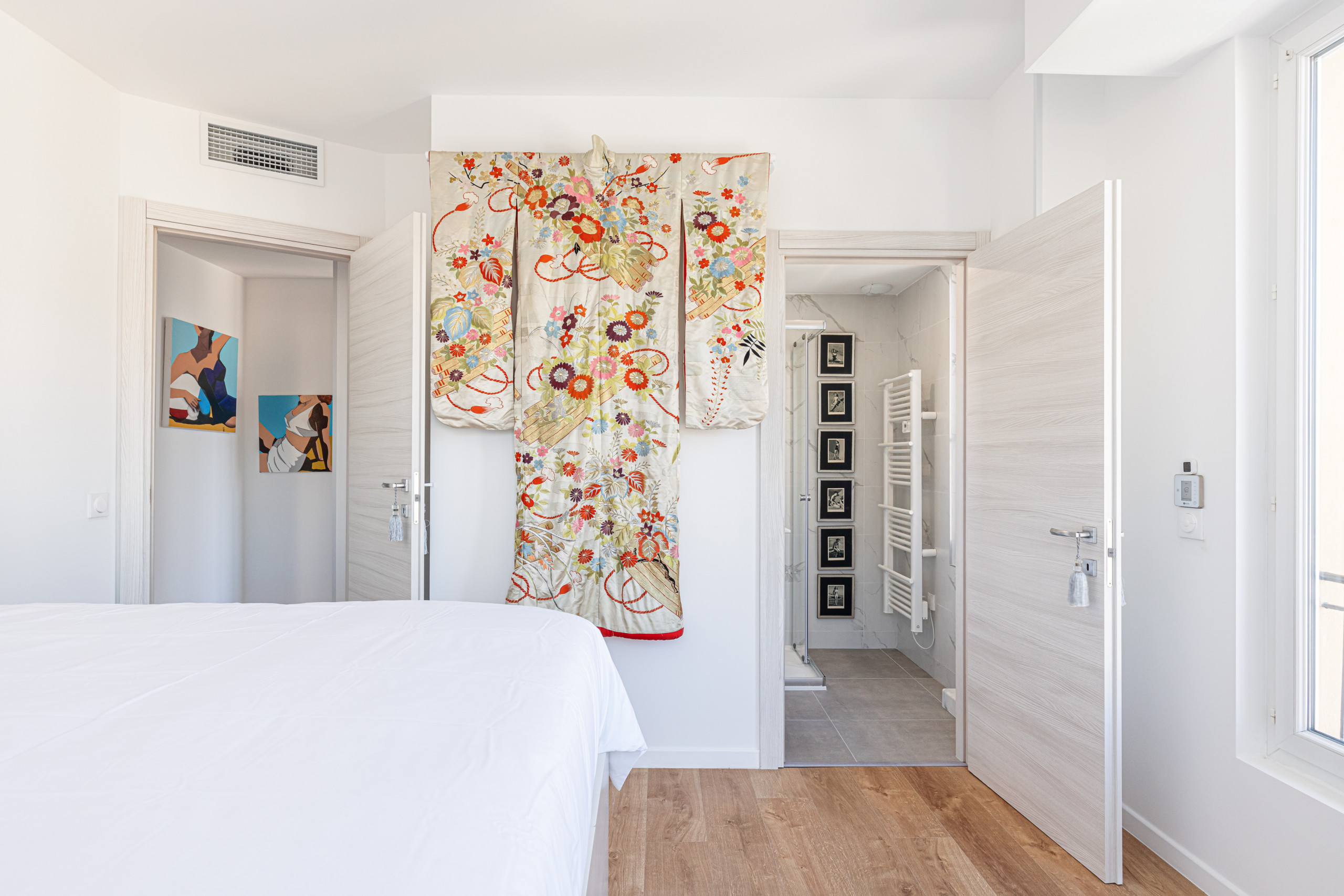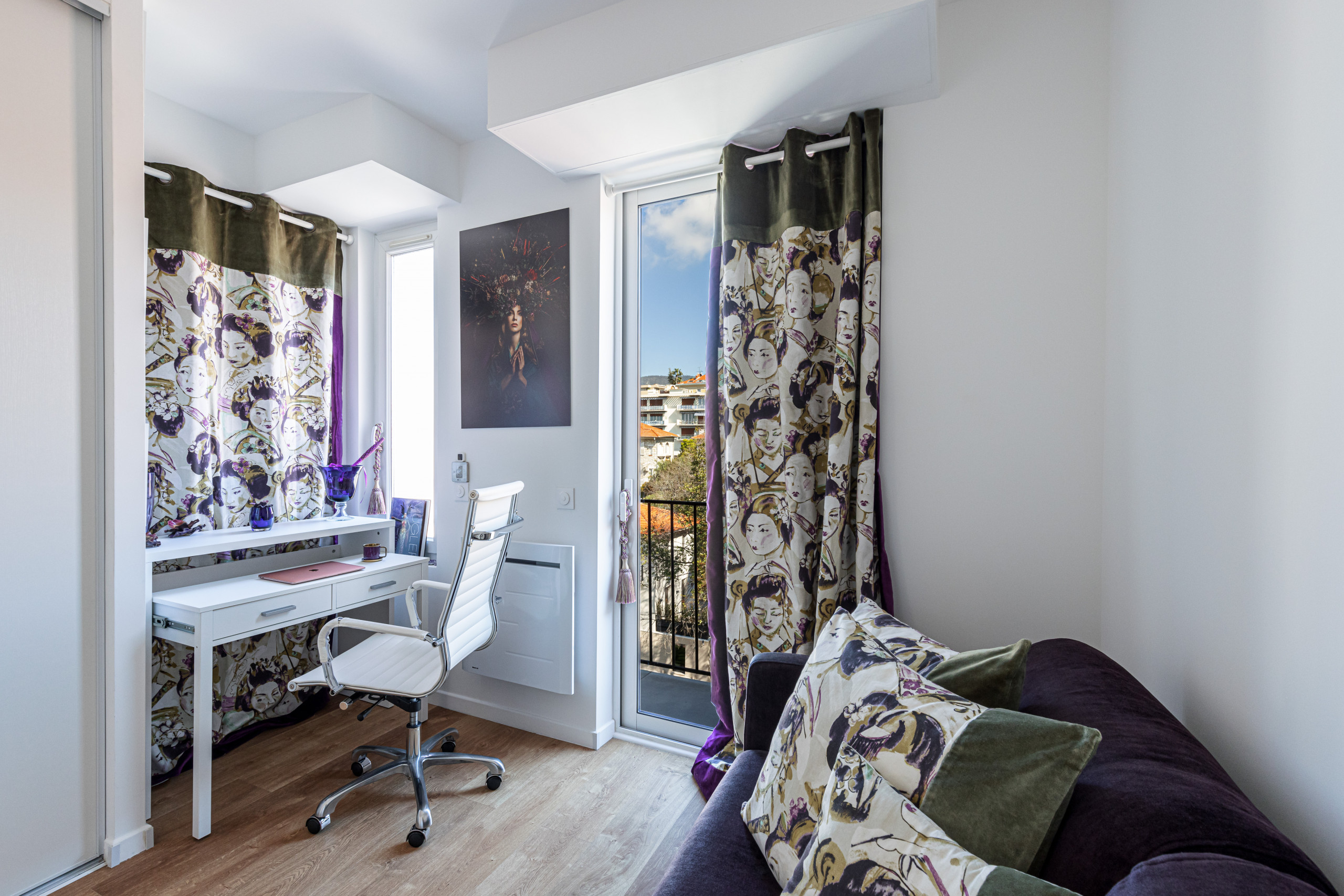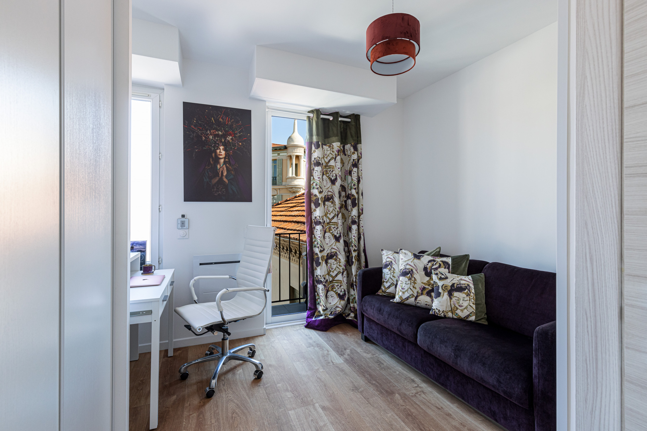 - un bureau décoré dans l'esprit japonisant, avec espace de travail, canapé-lit confortable (120cm), placard de rangement, et une deuxième salle d'eau avec douche, meuble vasque, sèche-serviette