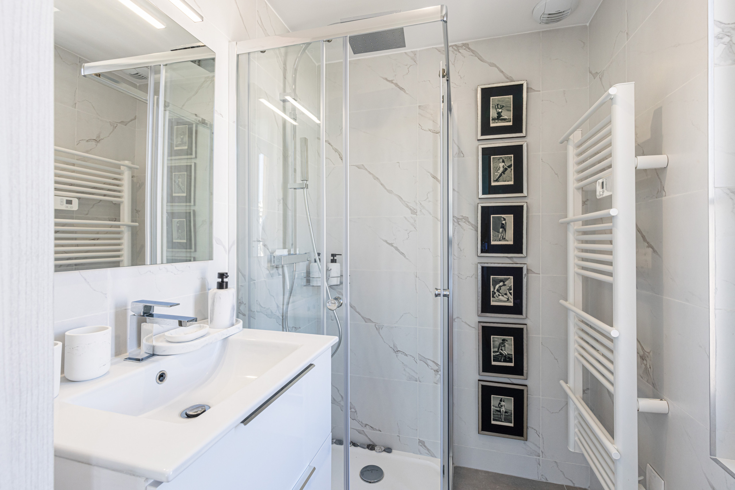 - une belle chambre avec un lit Queen Size, placard de rangement, et une salle d'eau attenante avec douche, meuble vasque, sèche-serviette