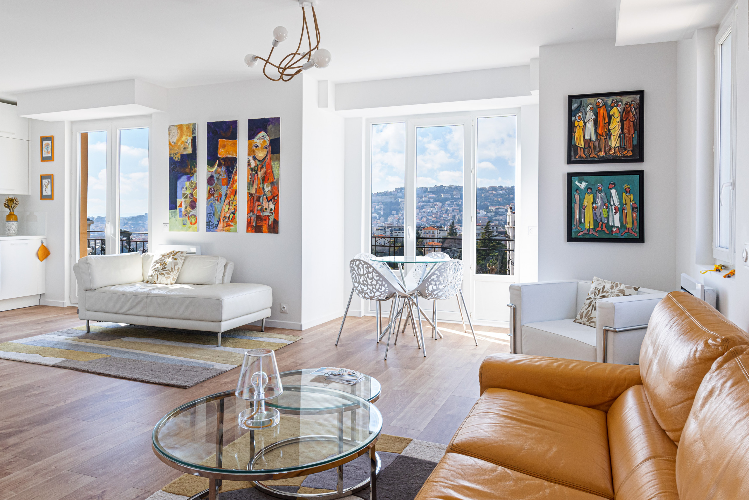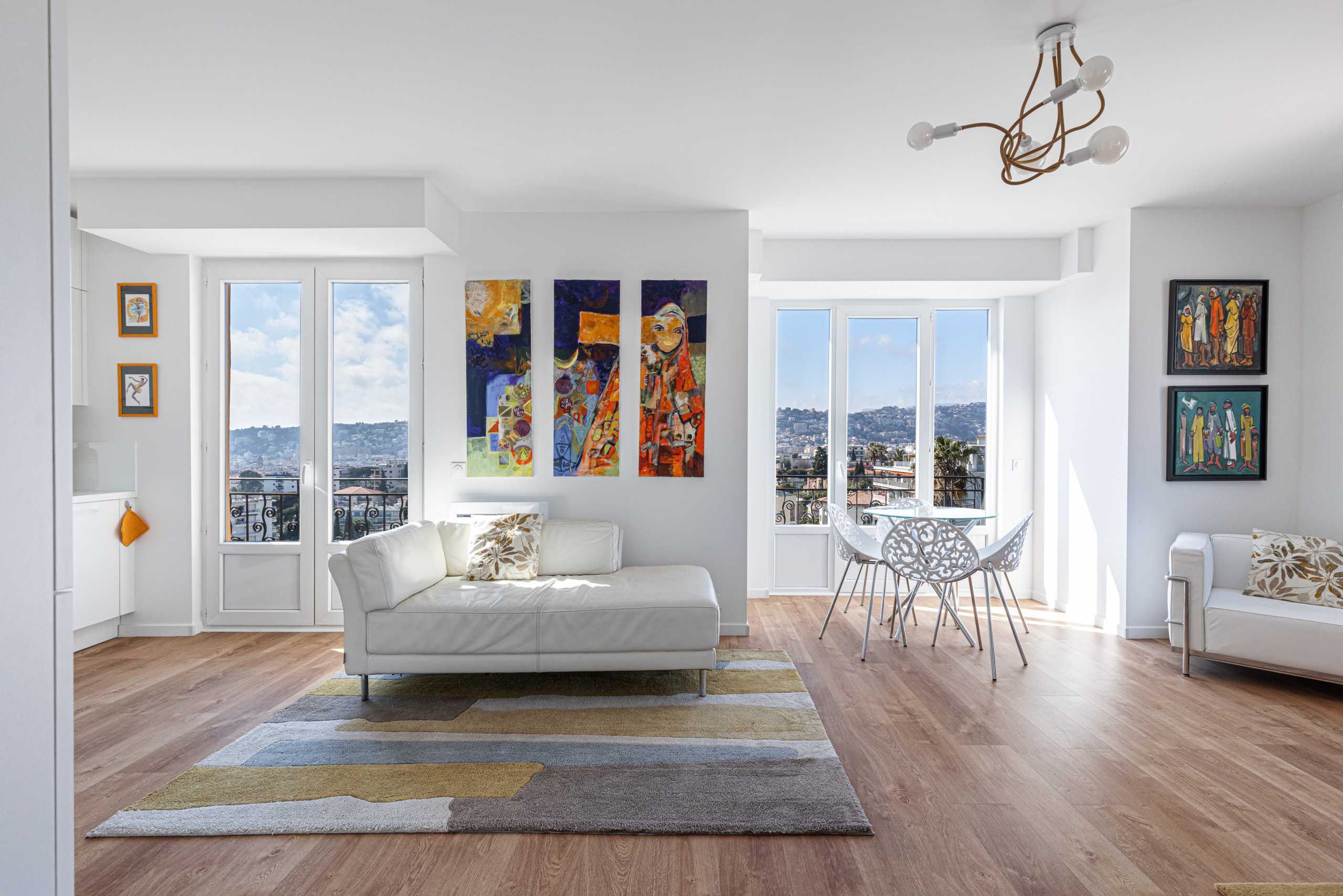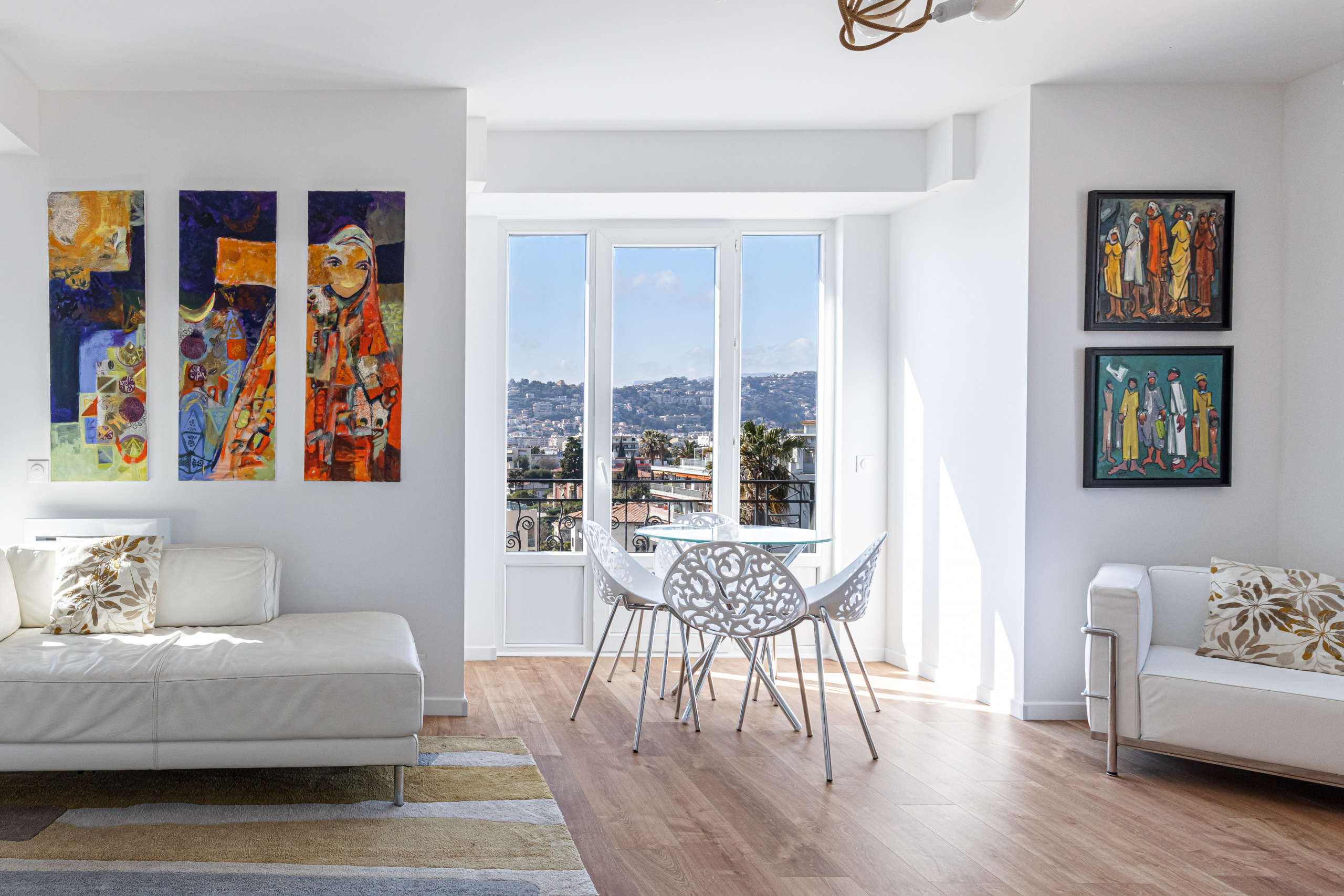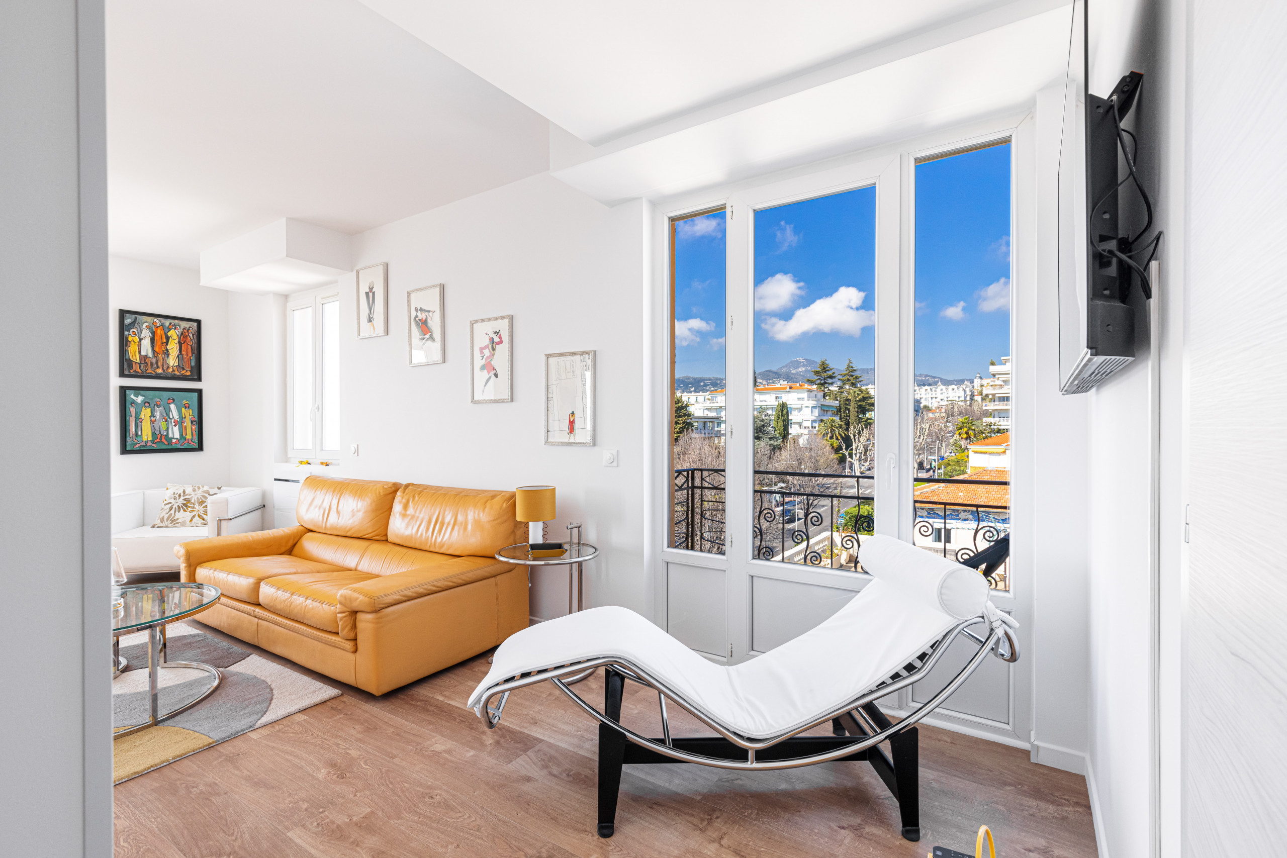 - un grand séjour avec trois balcons en double exposition (Nord et Ouest), dont un avec table et chaises et un autre avec transat, deux canapés, un fauteuil et un lit de repos, une télévision avec box Tv, un coin repas niché dans un bow window avec table à manger