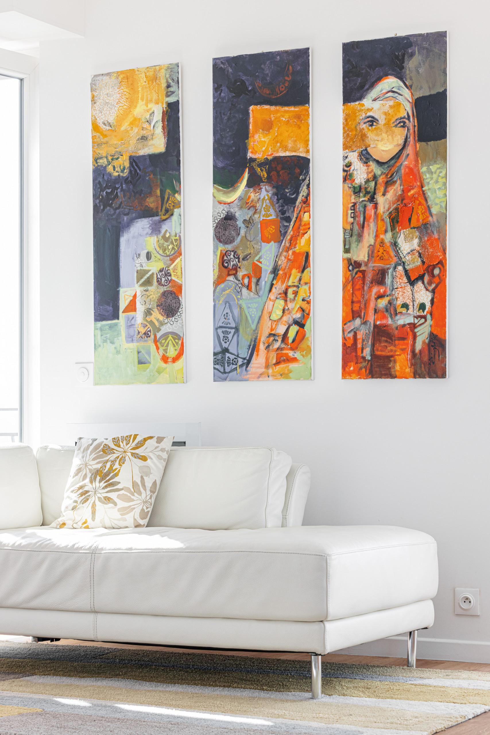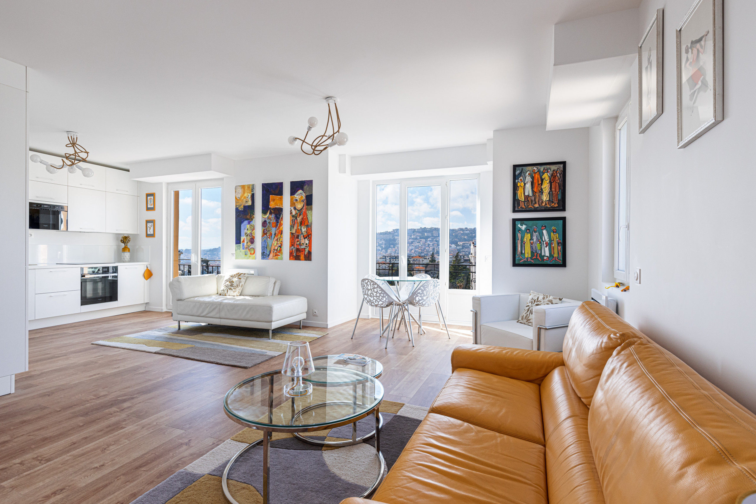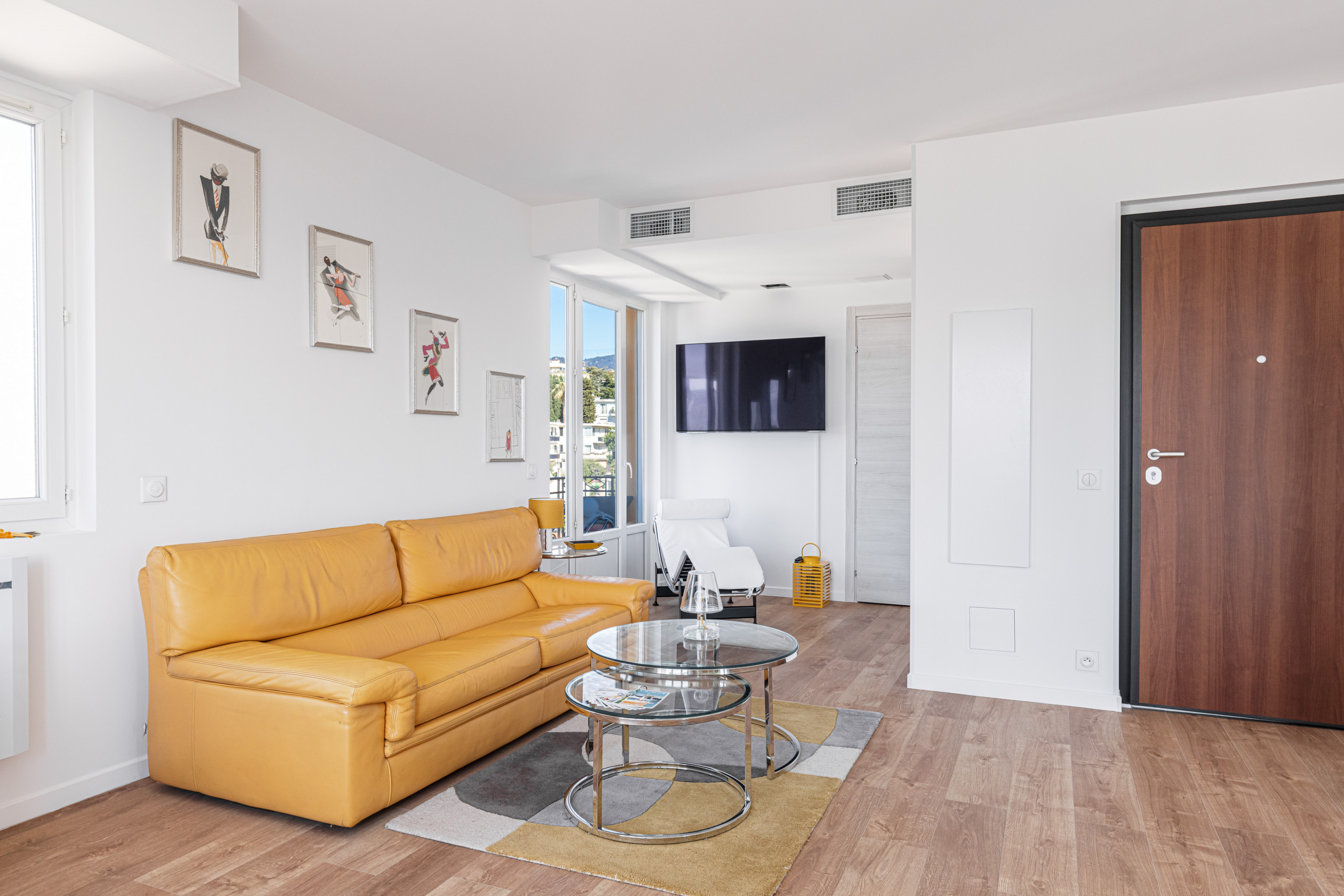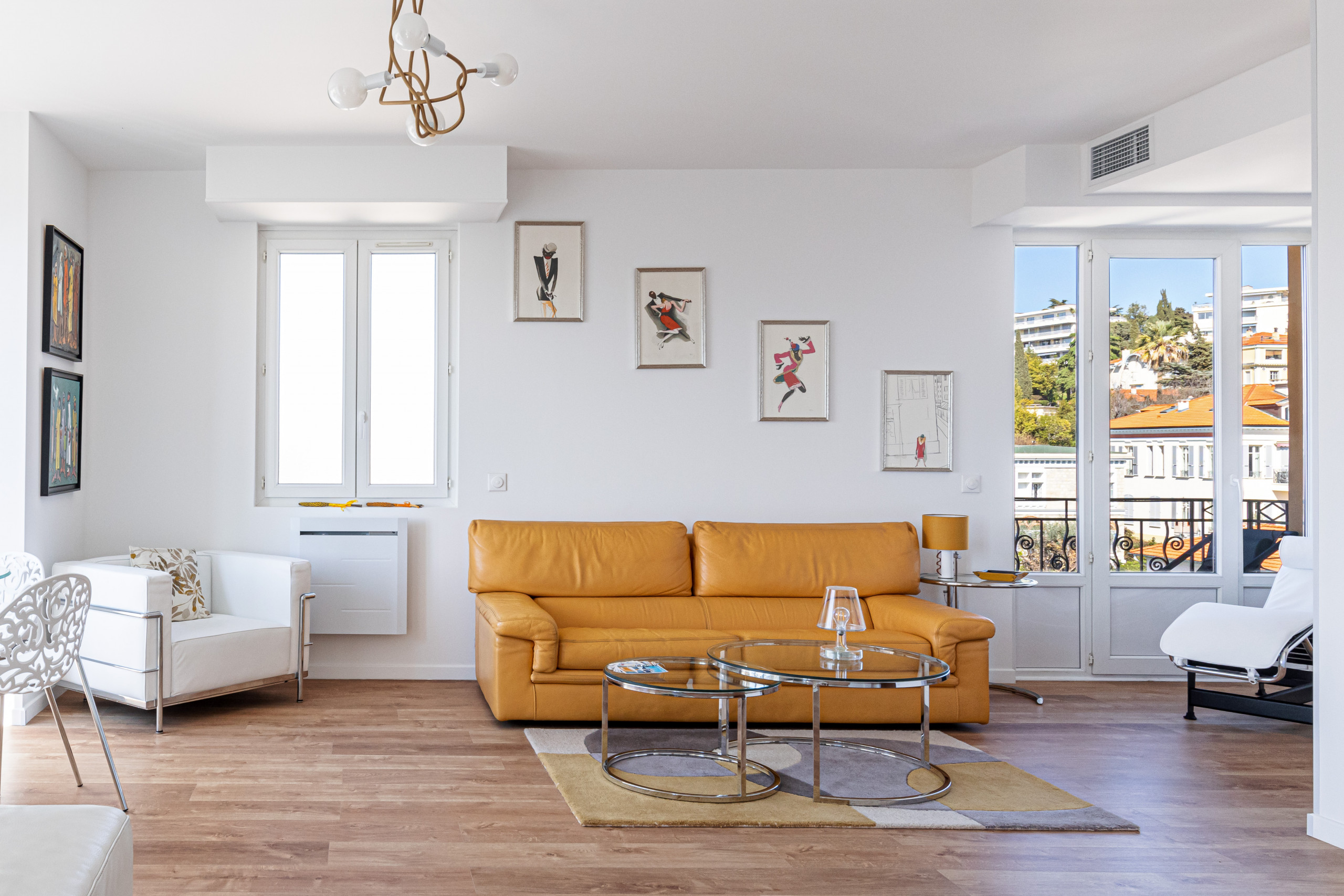 - un grand séjour avec trois balcons en double exposition (Nord et Ouest), dont un avec table et chaises et un autre avec transat, deux canapés, un fauteuil et un lit de repos, une télévision avec box Tv, un coin repas niché dans un bow window avec table à manger