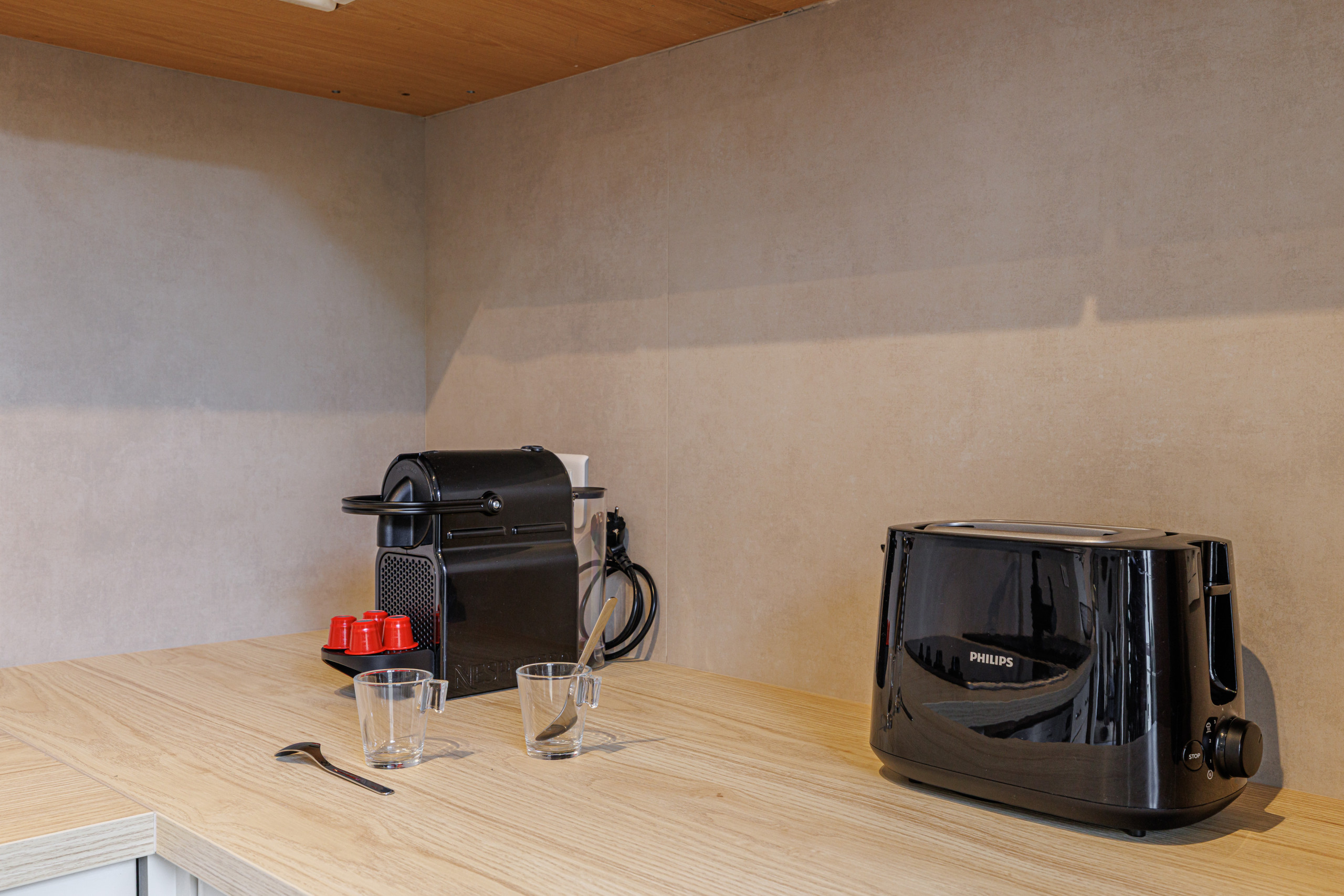 Réfrigérateur, plaques de cuisson, four, micro-ondes, Nespresso, bouilloire, grille-pain et vaisselle complète.