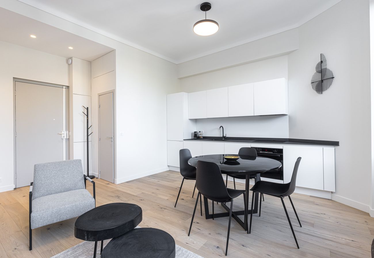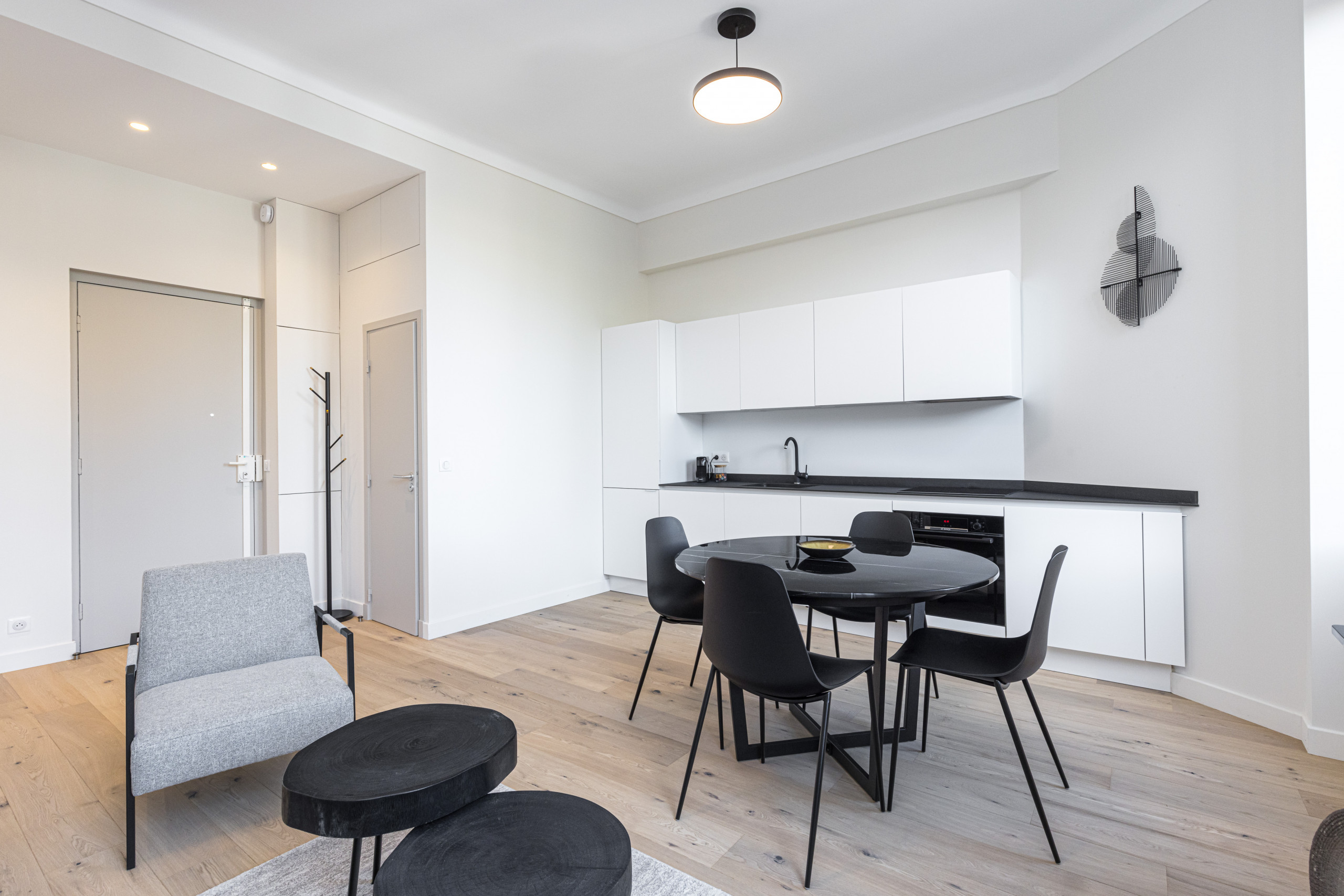 L'appartement dispose d'une pièce à vivre composée d'un salon avec TV, Canapé, une cuisine ouverte ( Réfrigérateur, four, machine à café Nespresso, plaques de cuisson vitro-céramiques, bouilloire ), coin repas avec table et chaises.