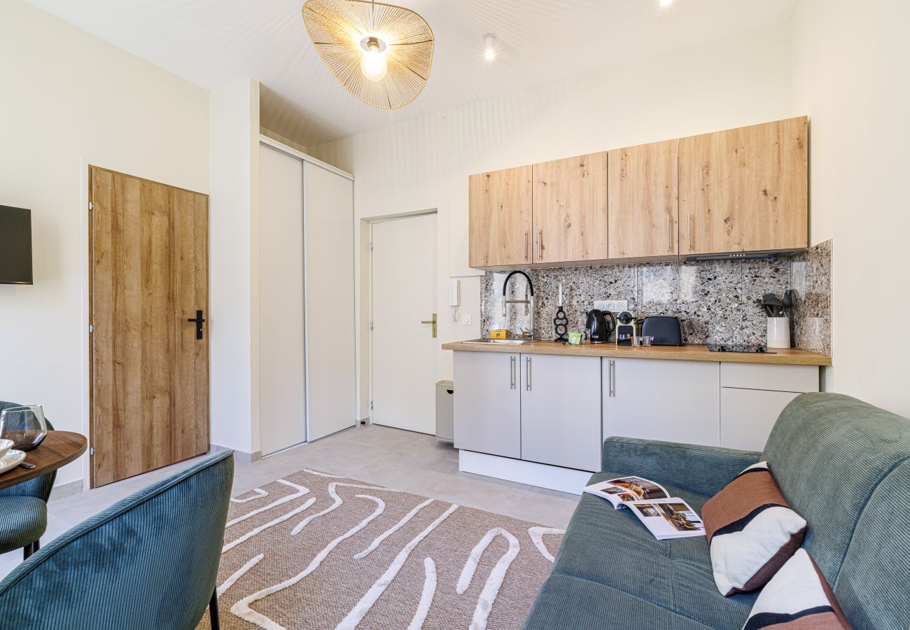 - Vous entrerez directement dans la pièce à vivre composée d’une cuisine ouverte avec plaques vitrocéramiques, micro-ondes, cafetière Nespresso, bouilloire, grille pain. Le coin salon dispose quant à lui d’un canapé, d’une table à dîner & fauteuils, d’une Smart TV, d’une connexion Wifi gratuite & d’un placard de rangement.