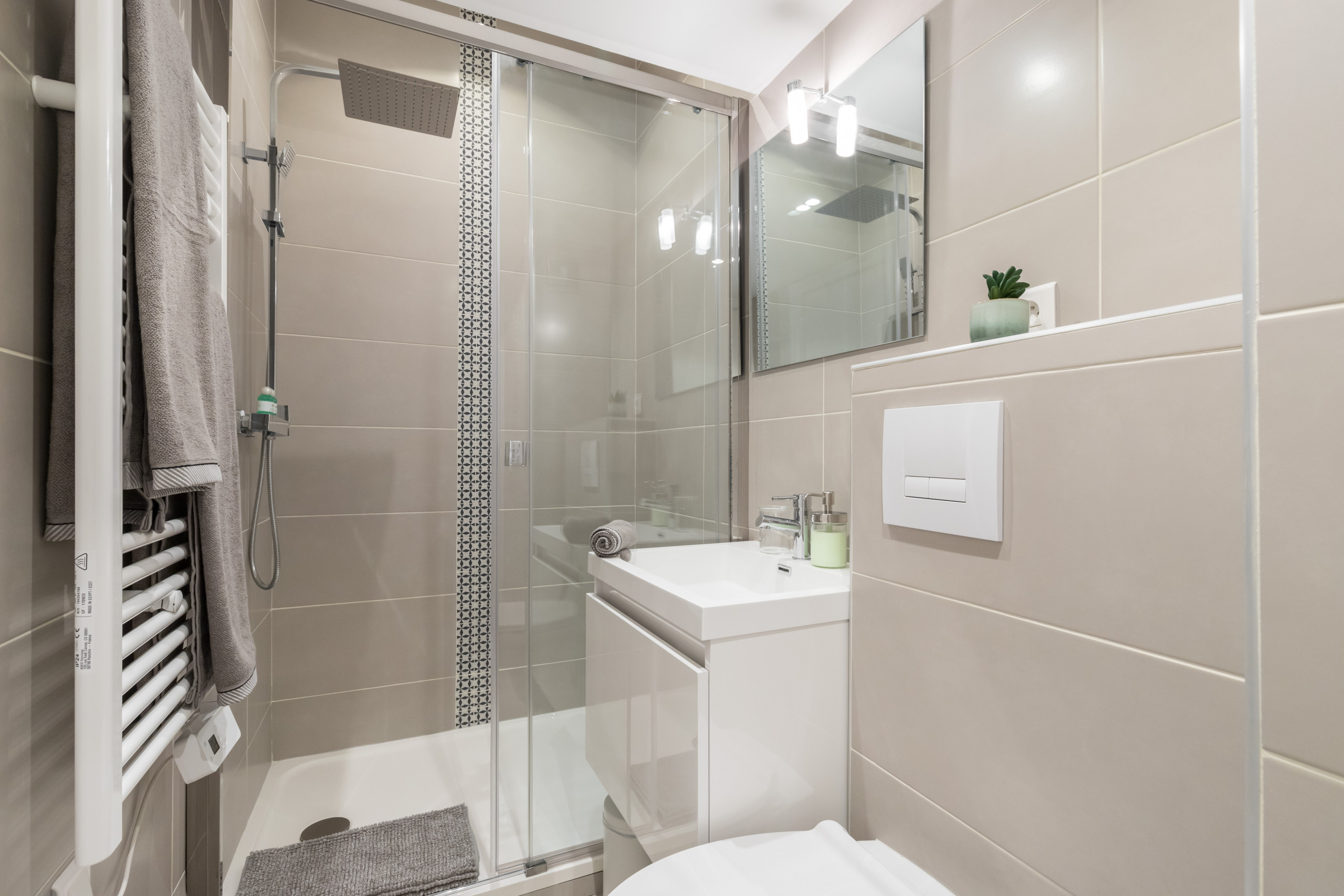La salle d'eau comprend une douche à l'italienne, wc suspendus, lavabo.