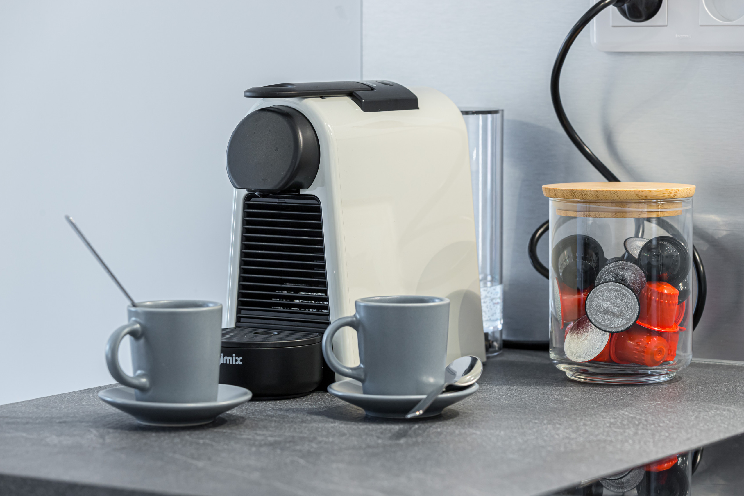 Cuisine entièrement équipée avec micro-onde, réfrigérateur, plaques de cuisson, bouilloire, grille pain, machine a cafe Nespresso, ustensiles et couverts.