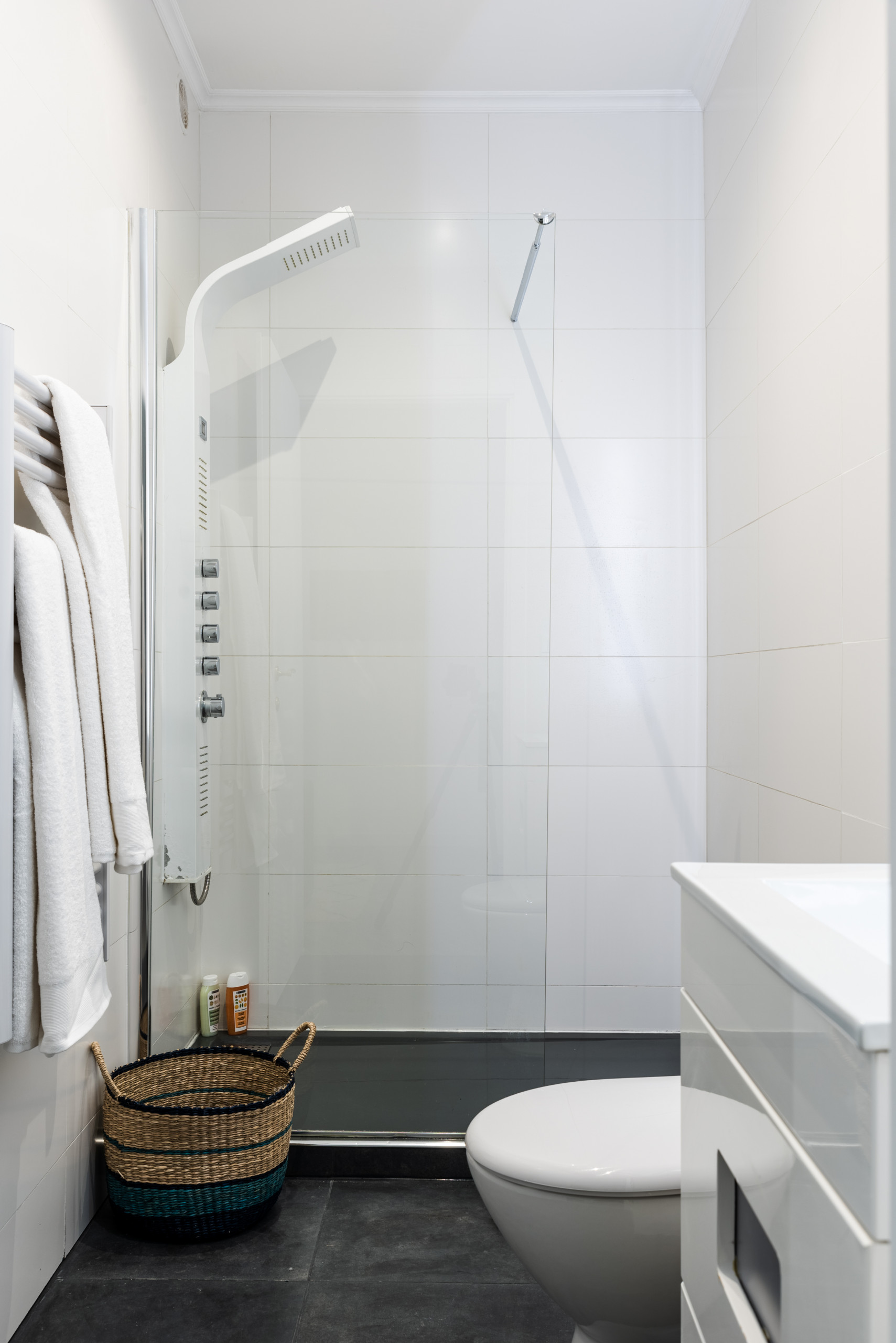 La salle de bain est composée d'une grande douche à l'italienne, un meuble vasque avec miroir, un sèche serviettes et un wc.