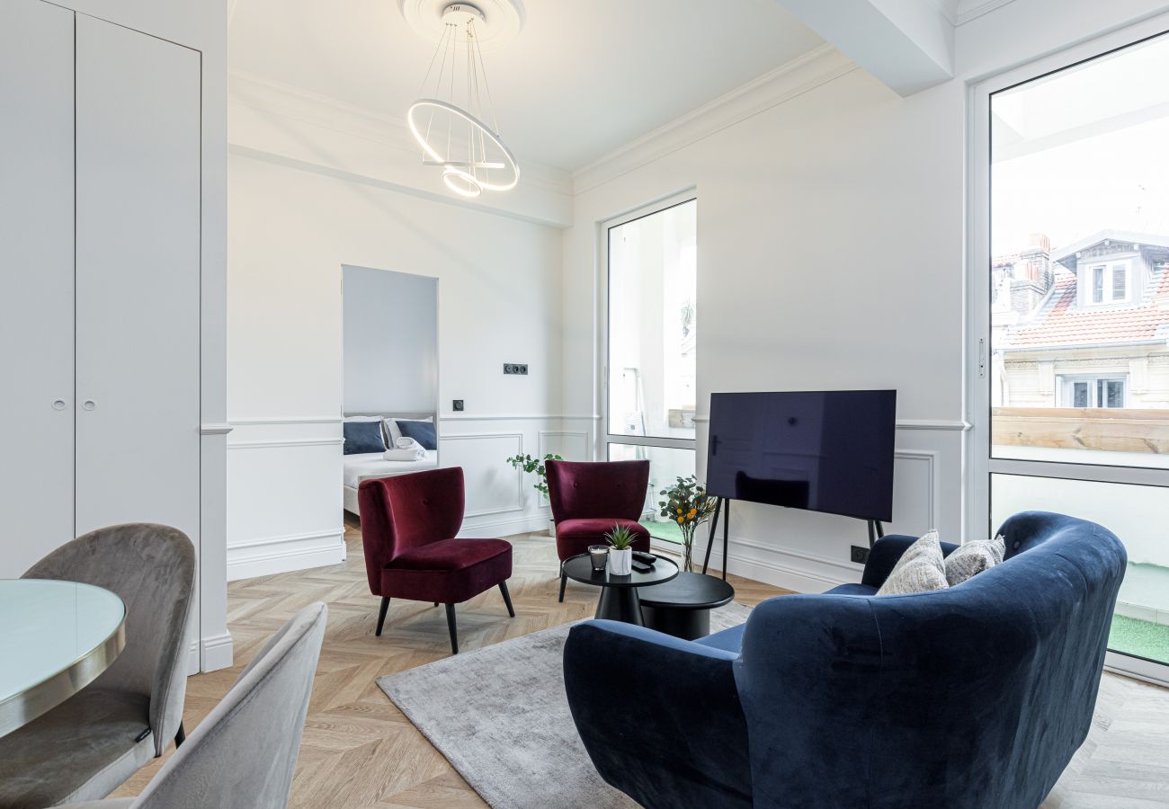 Le salon donne sur le balcon avec 2 baies vitrés, il est équipé d'un canapé, 2 fauteuils, une TV OLED, Internet WIFI Gratuit.