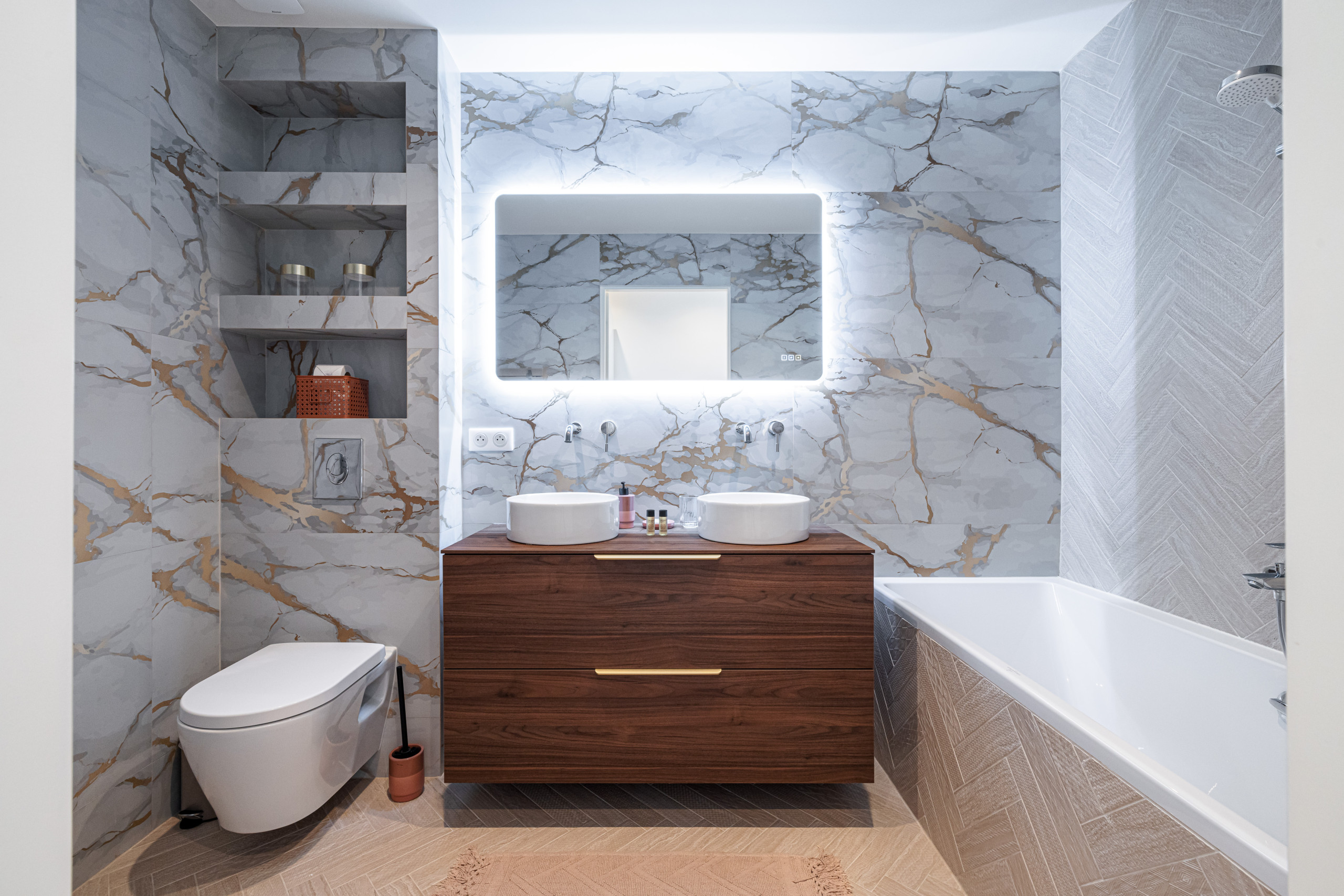 - Enfin, le logement dispose de deux salles d’eau, toutes deux attenantes aux chambres accessibles par un couloir commun, toutes deux équipées de meubles vasques/WC, d’une douche à l’italienne pour la première, & une baignoire pour la seconde.