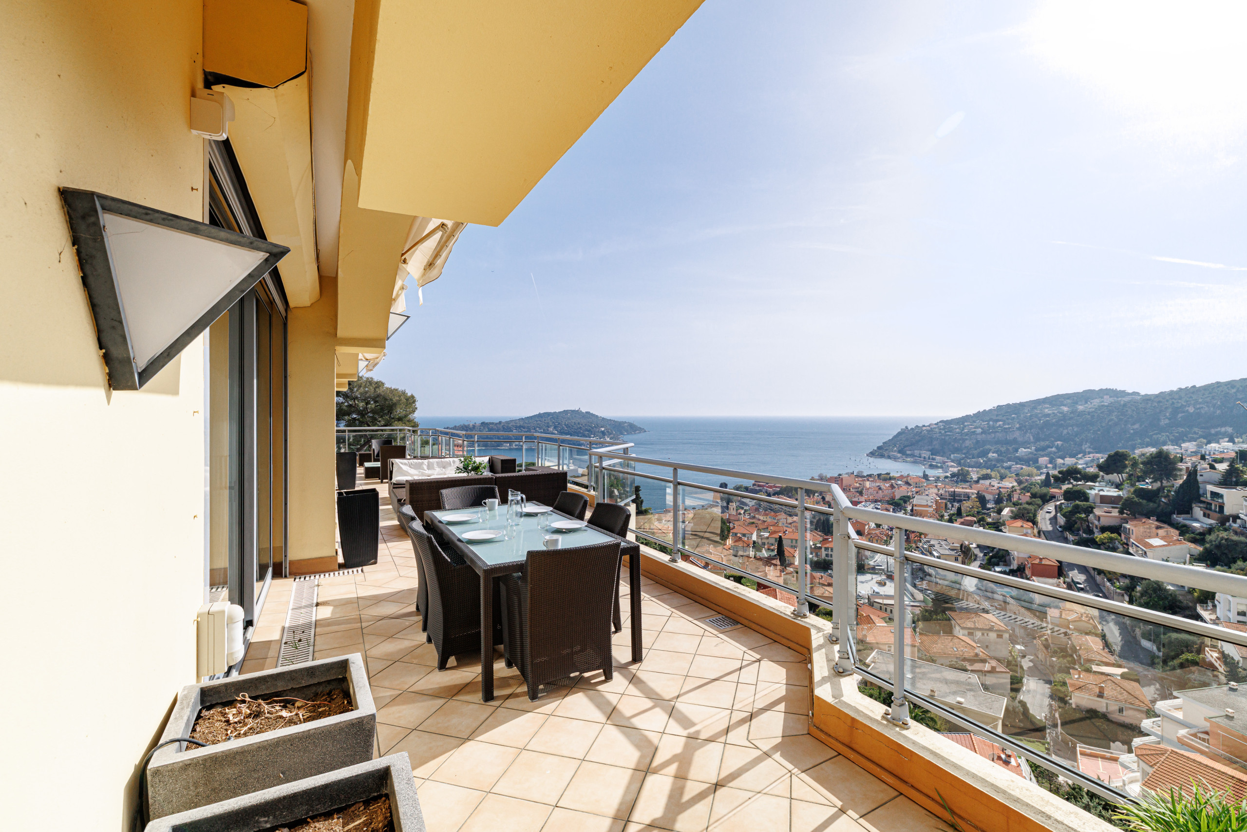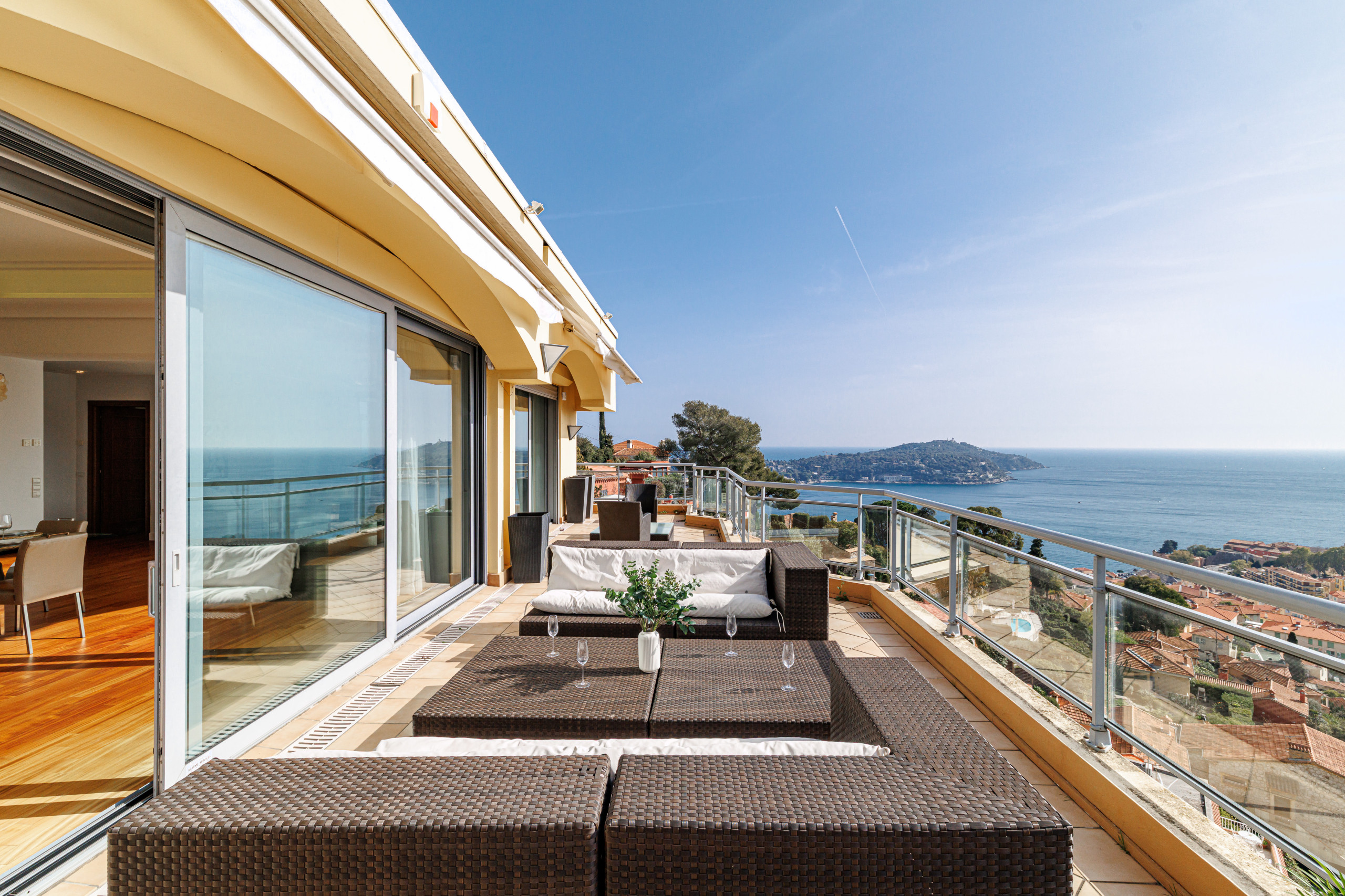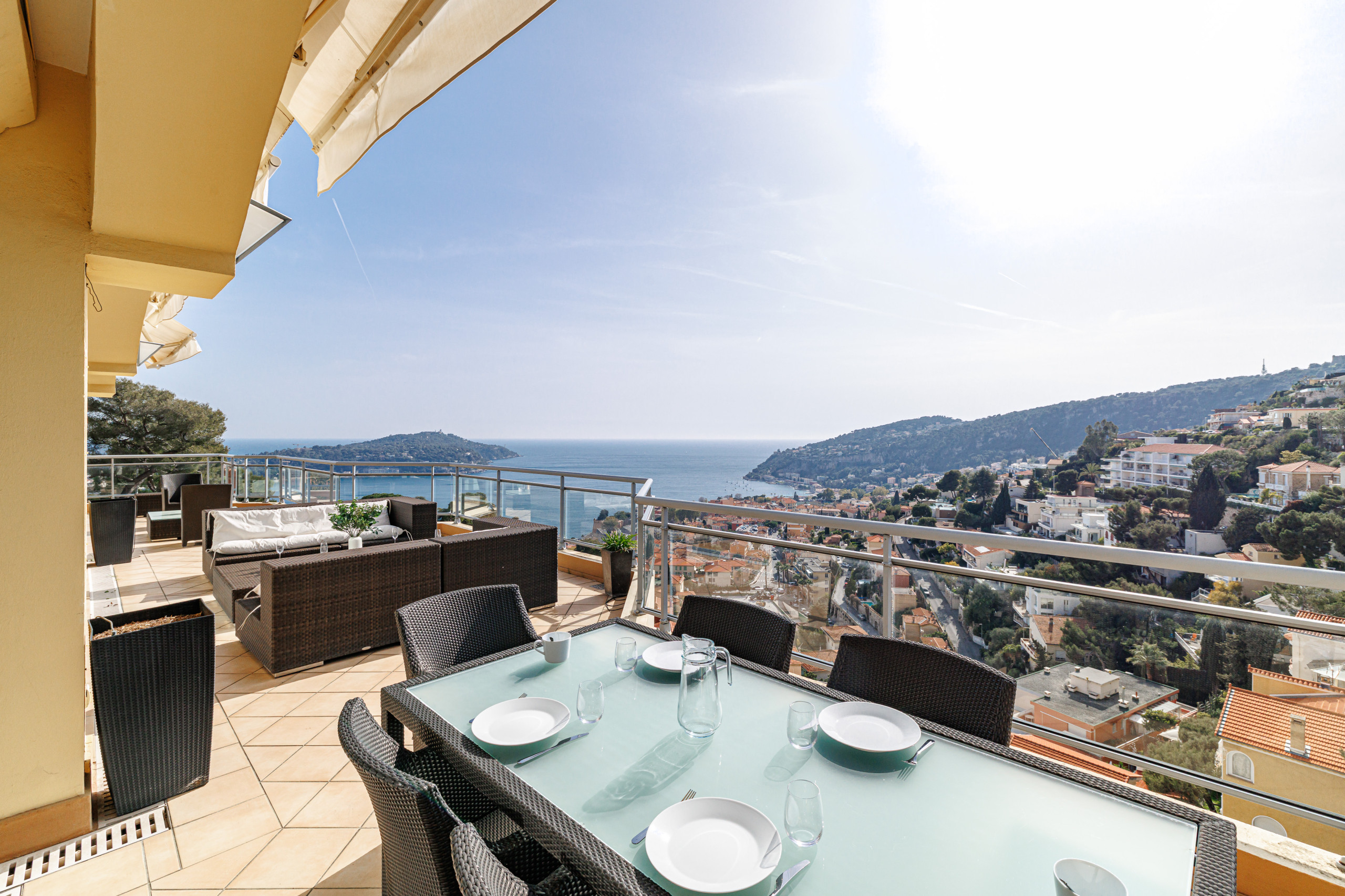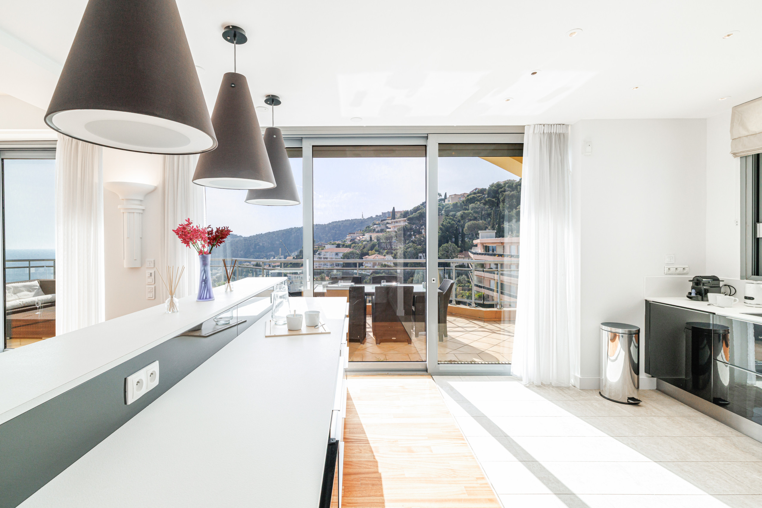 Le penthouse s’ouvre sur une grande terrasse longeant toute la façade de l’appartement, avec une vue imprenable sur la mer et la baie de Villefranche.