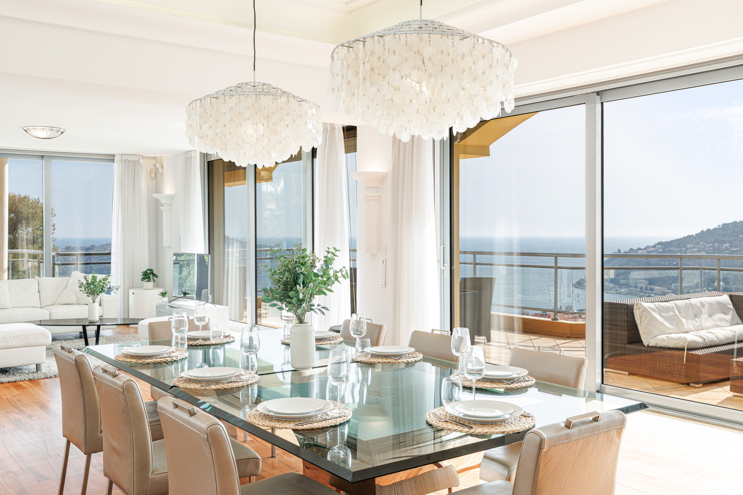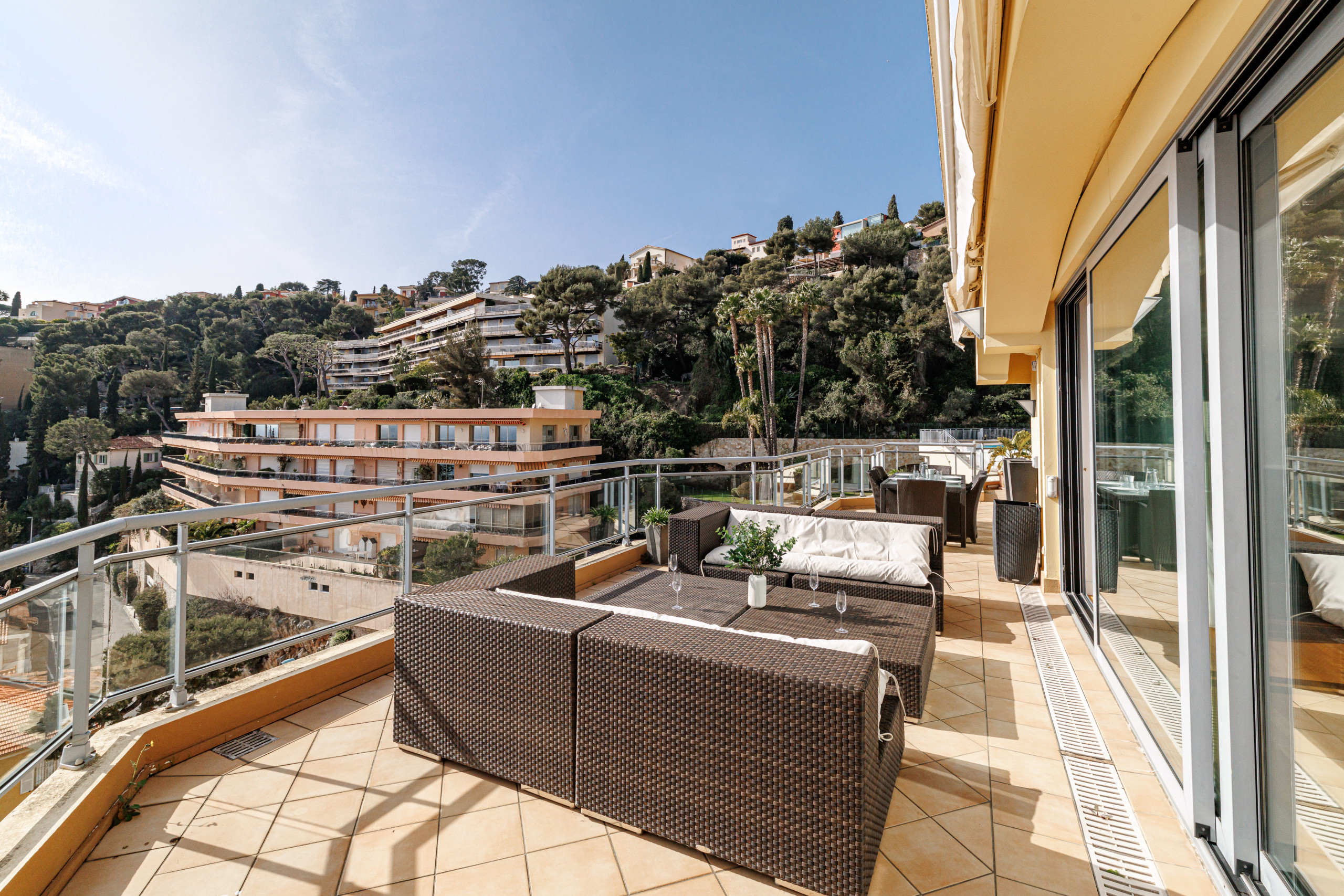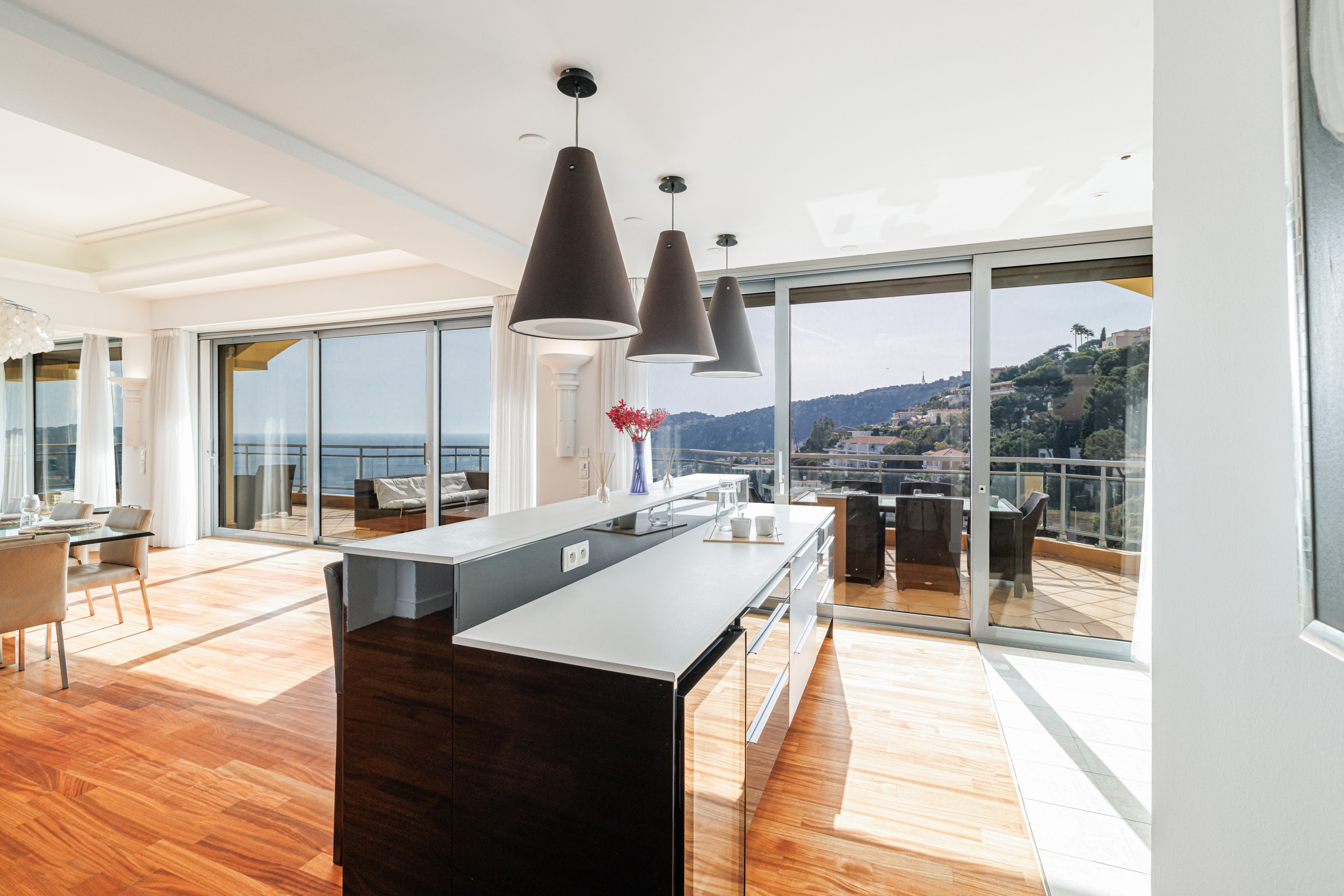 Le penthouse s’ouvre sur une grande terrasse longeant toute la façade de l’appartement, avec une vue imprenable sur la mer et la baie de Villefranche.