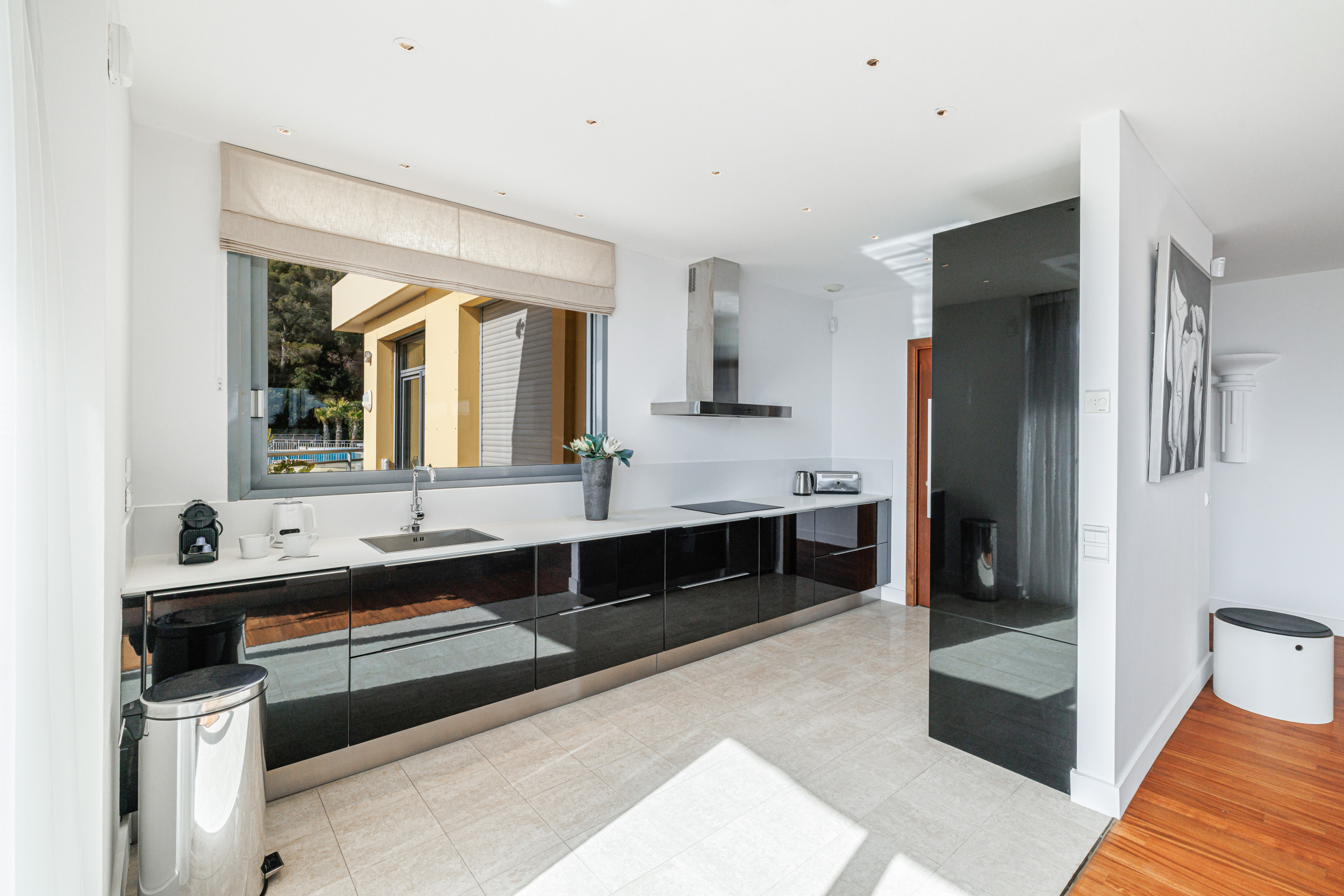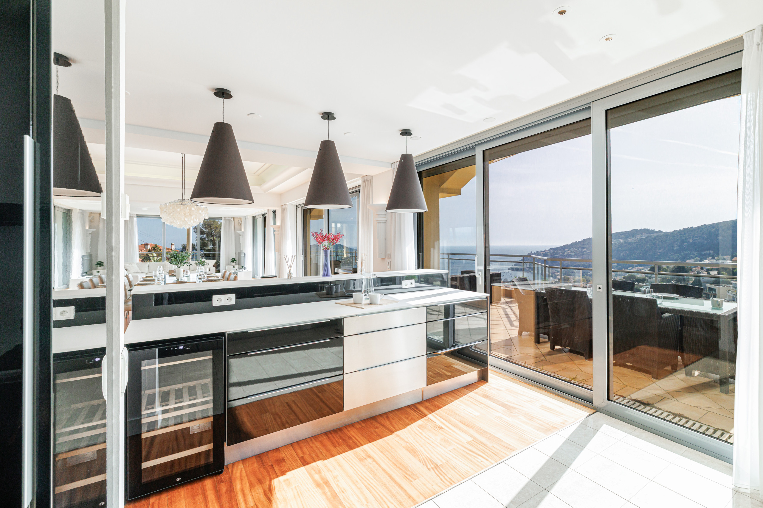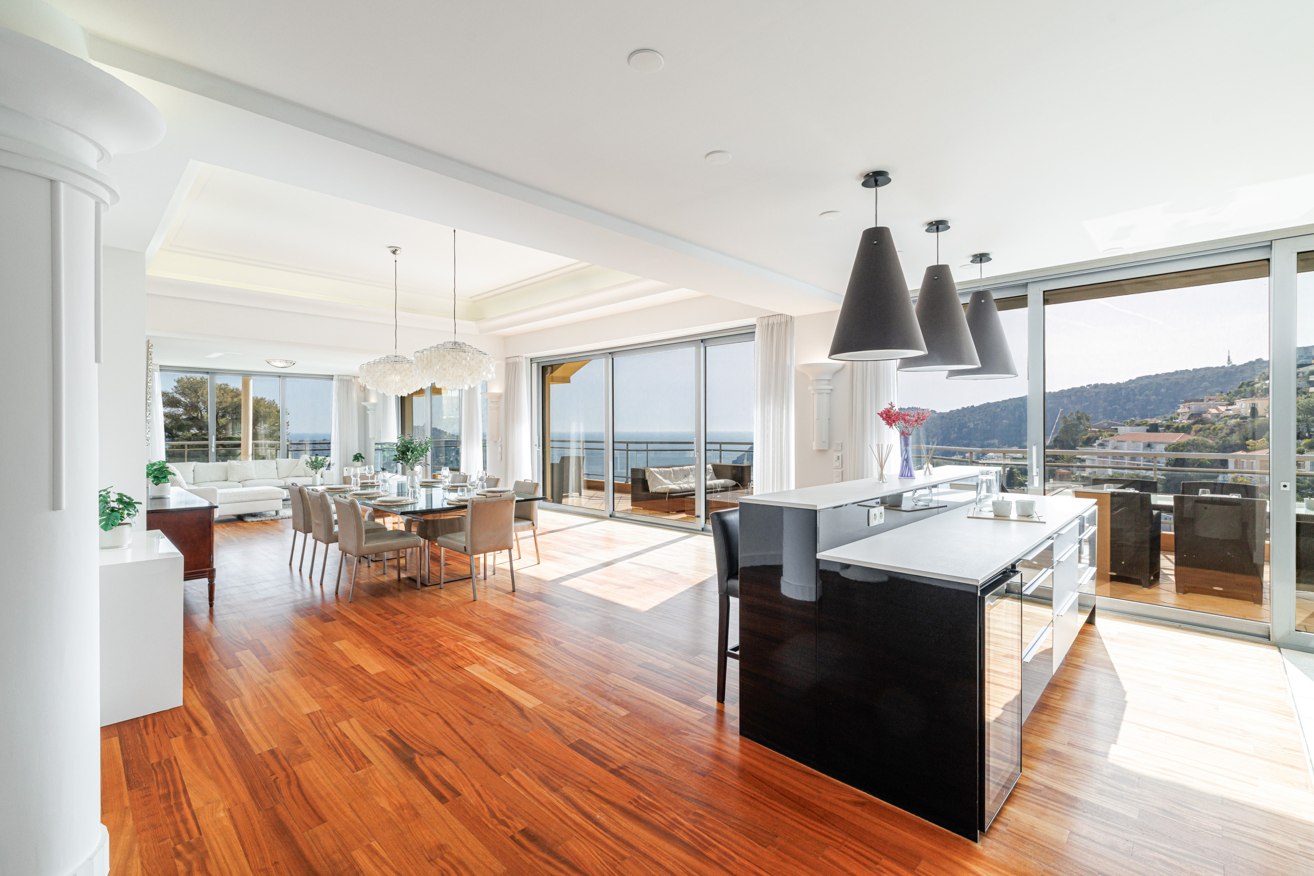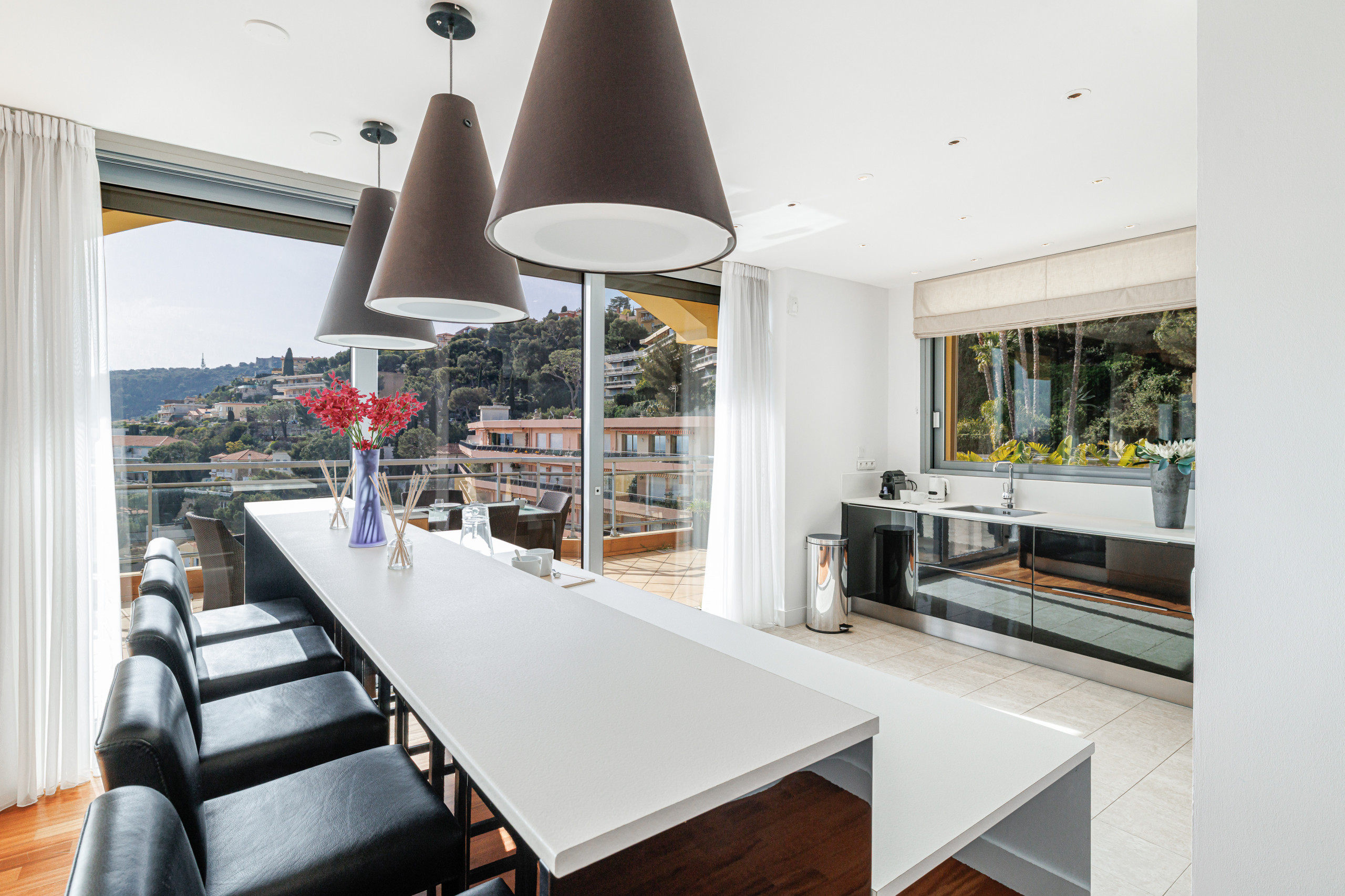 Le penthouse s’ouvre sur une grande terrasse longeant toute la façade de l’appartement, avec une vue imprenable sur la mer et la baie de Villefranche.