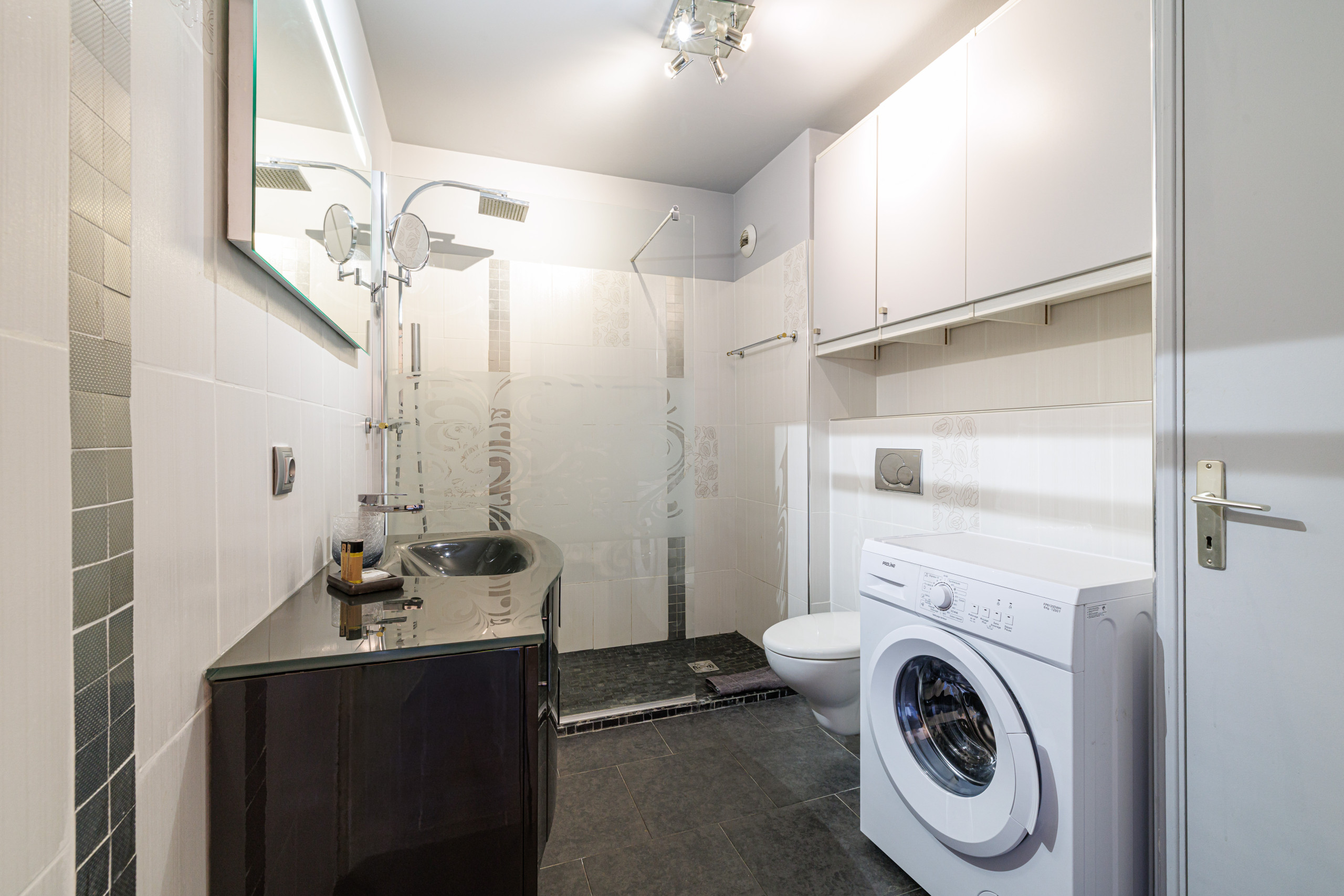 • Une salle d’eau moderne avec douche, WC, lave-linge et vasque