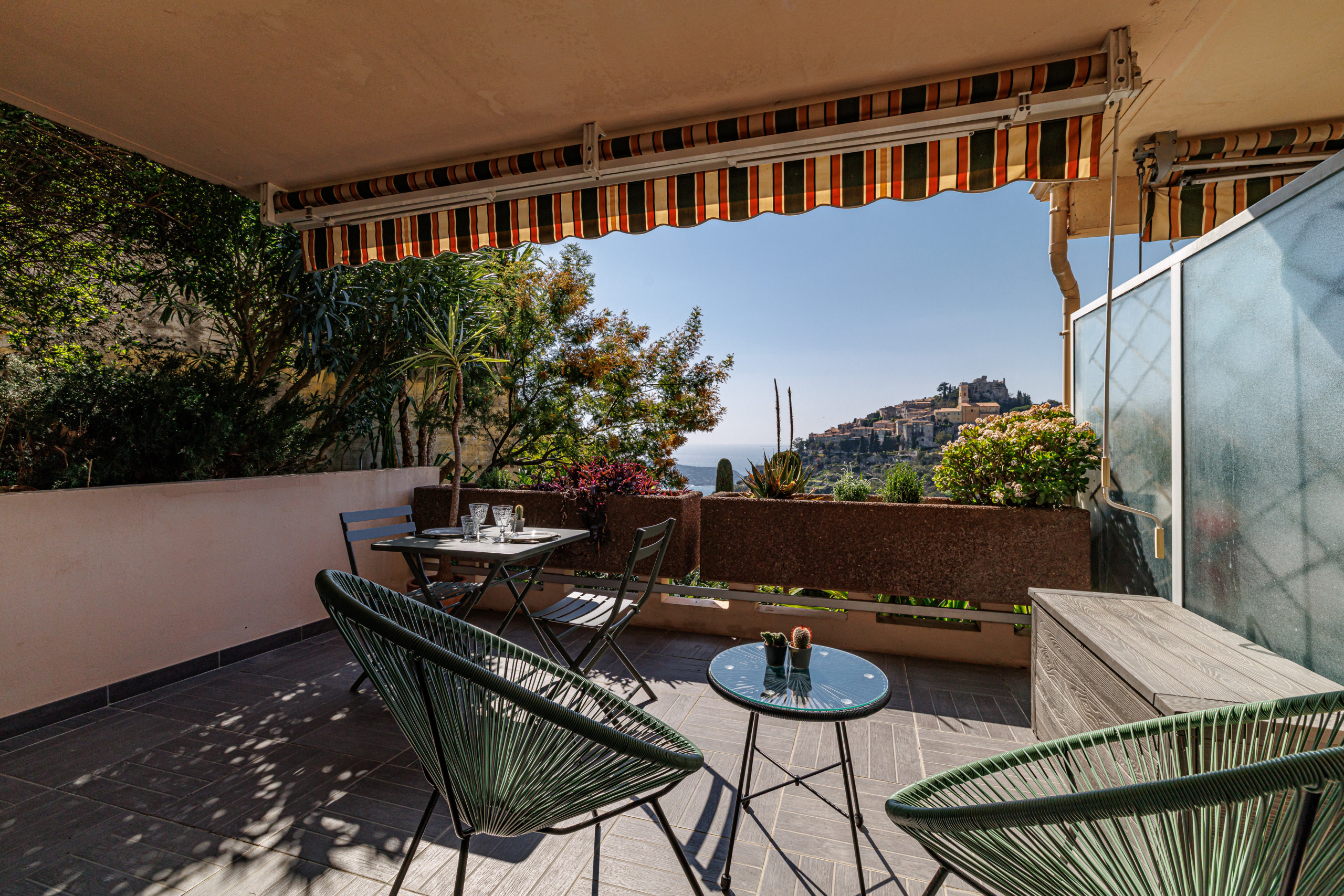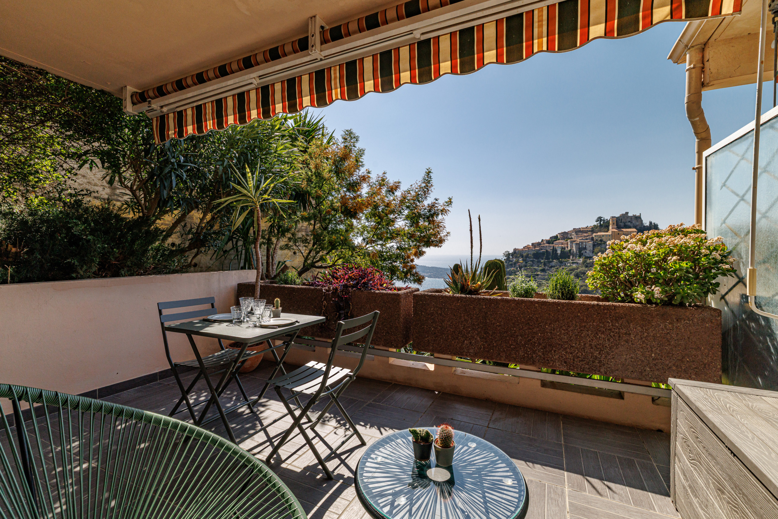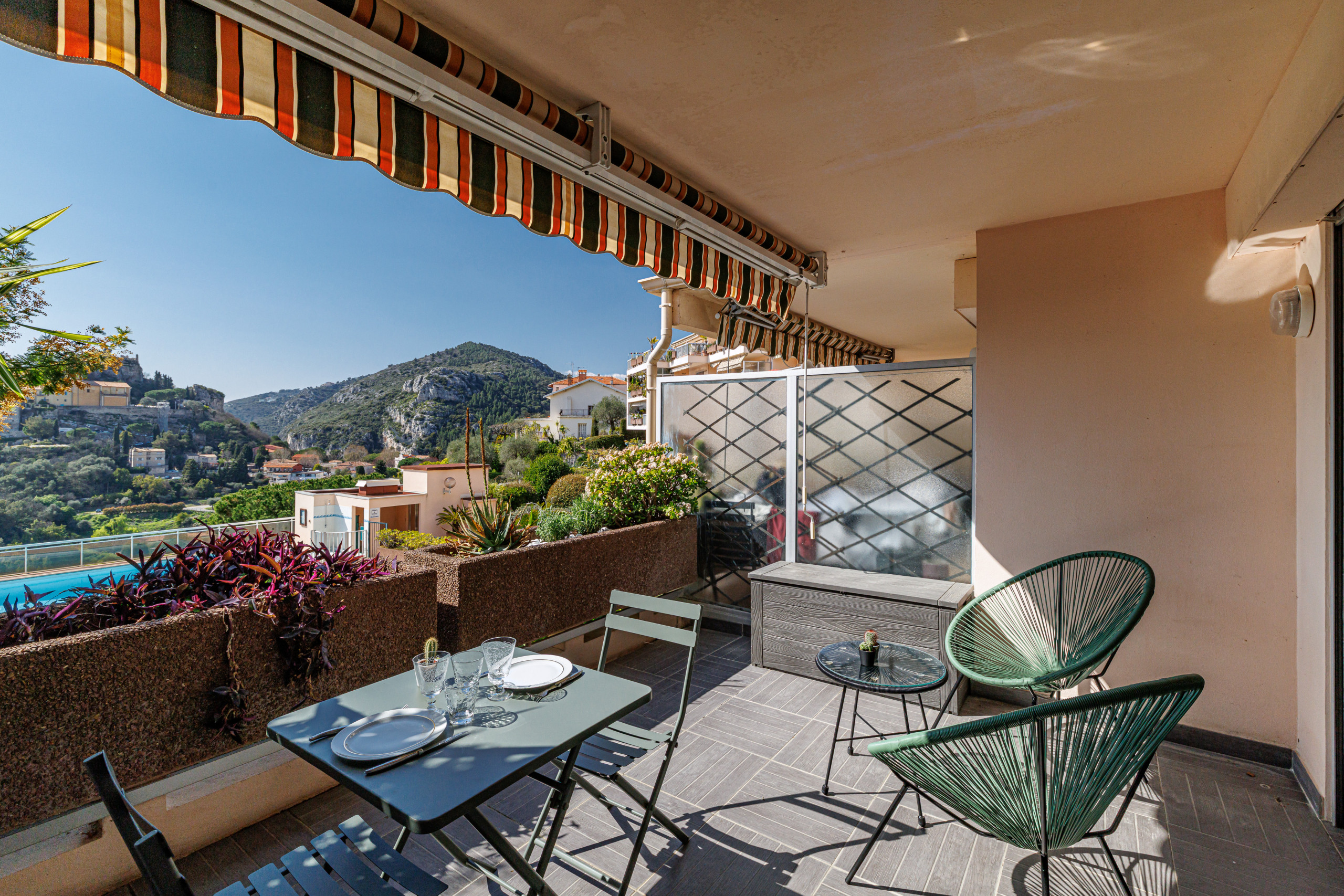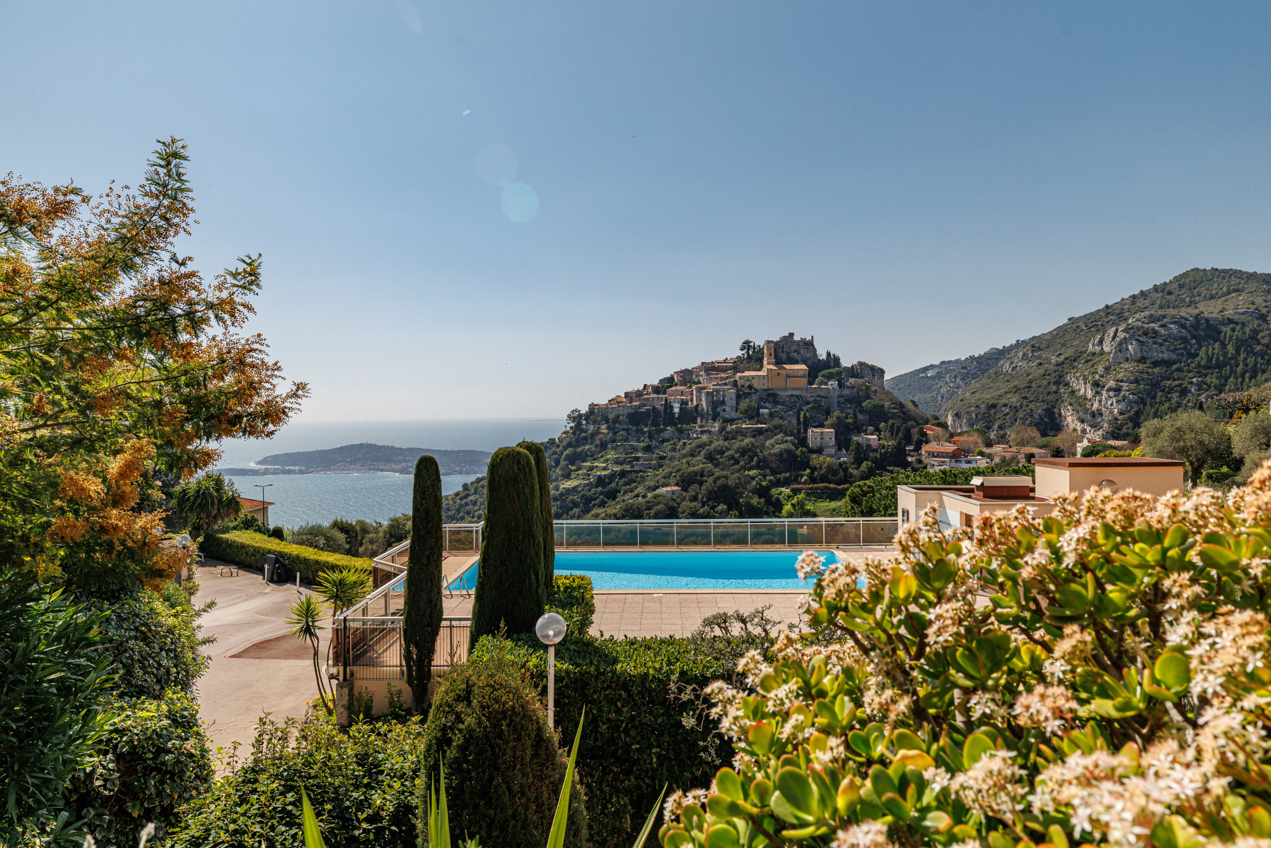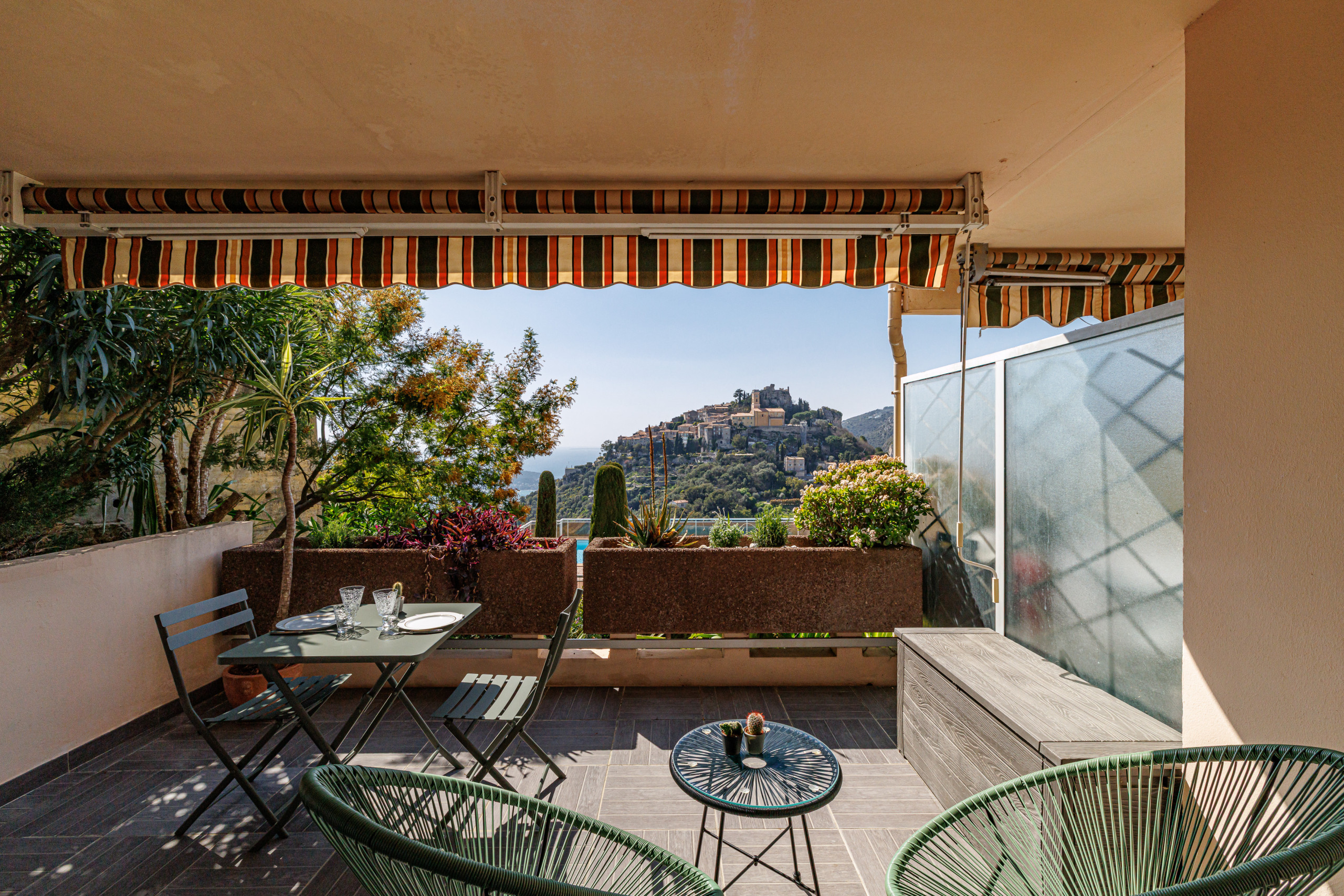 Vous serez immédiatement séduit par son atout majeur : une magnifique terrasse exposée plein sud, offrant une vue dégagée exceptionnelle sur le village d’Èze, la mer, le Cap de Saint-Jean-Cap-Ferrat ainsi que la piscine de la résidence.