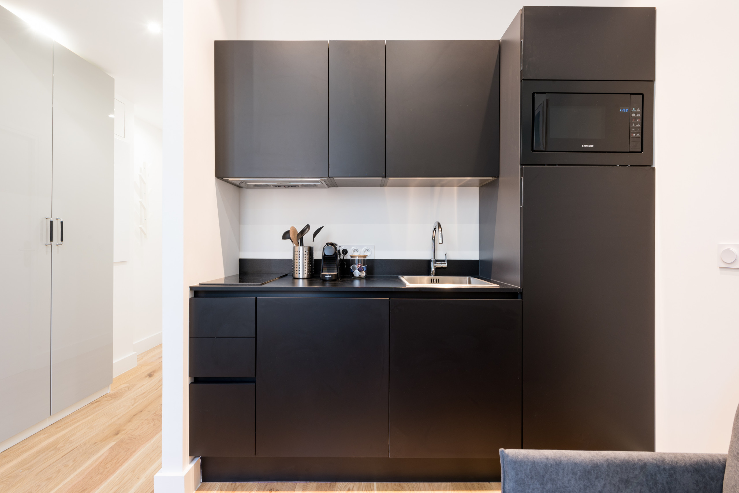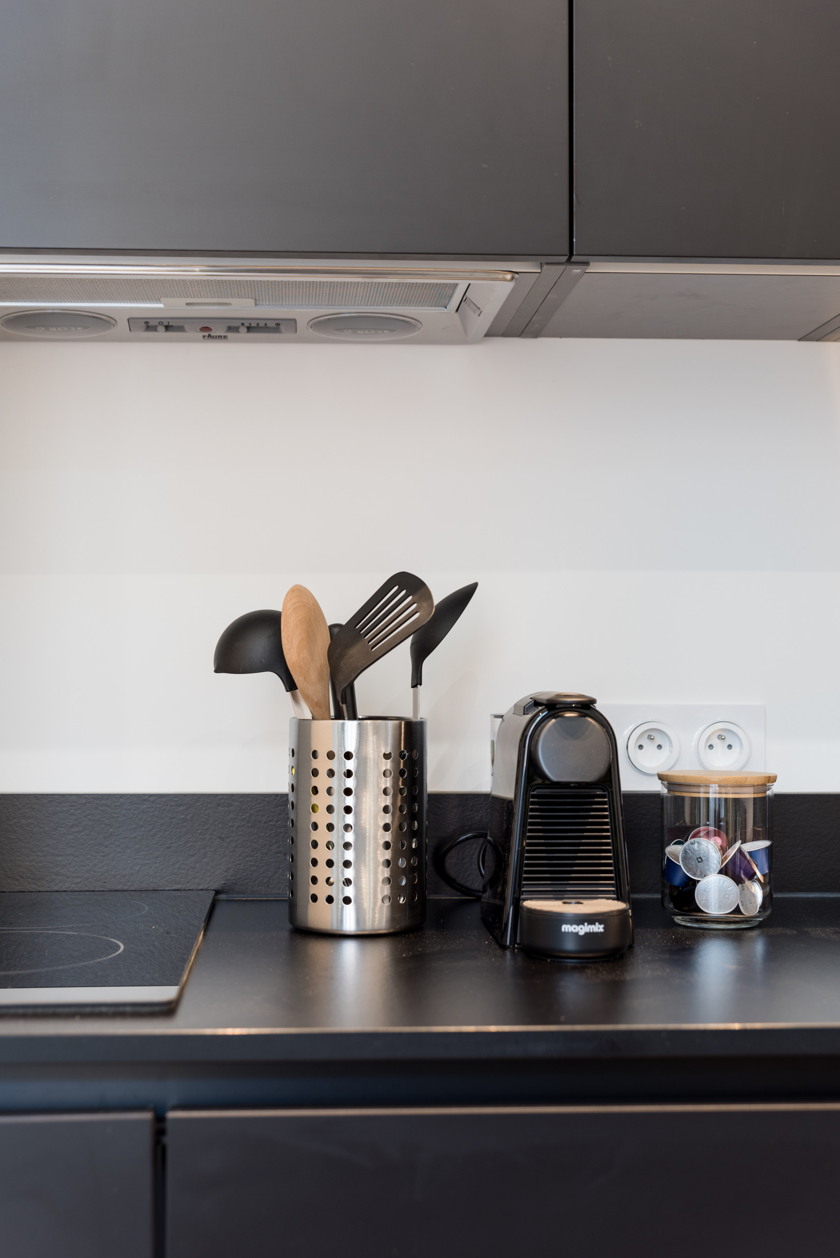 Réfrigérateur-congélateur, plaques de cuisson, hotte, lave-linge, machine Nespresso, bouilloire, grille-pain : tout le nécessaire pour cuisiner en toute simplicité.