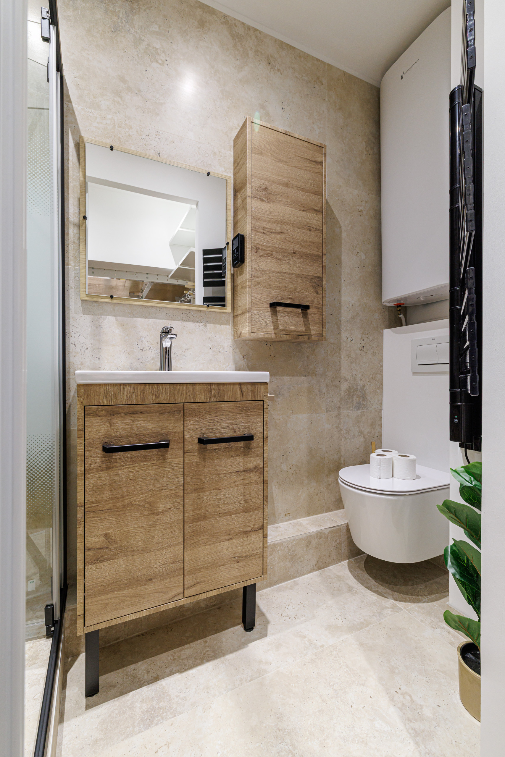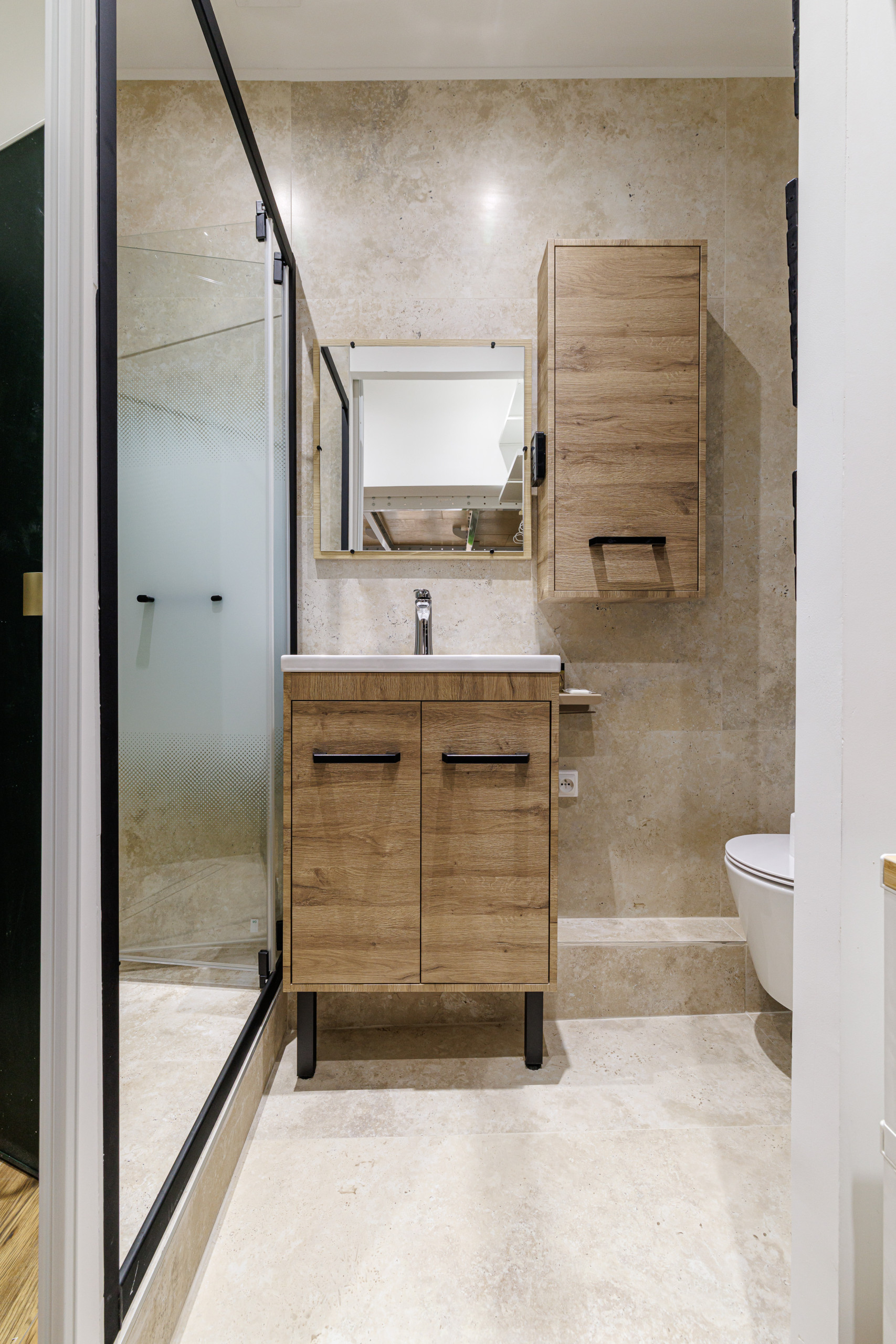 • Une salle d’eau moderne avec douche, WC et vasque