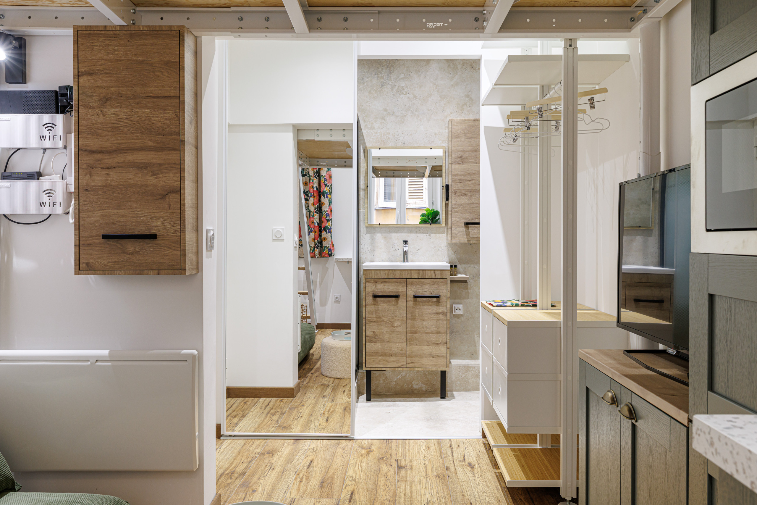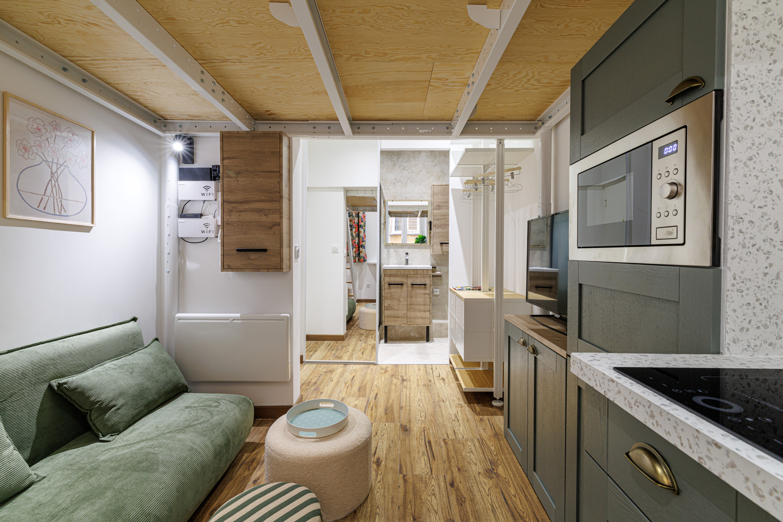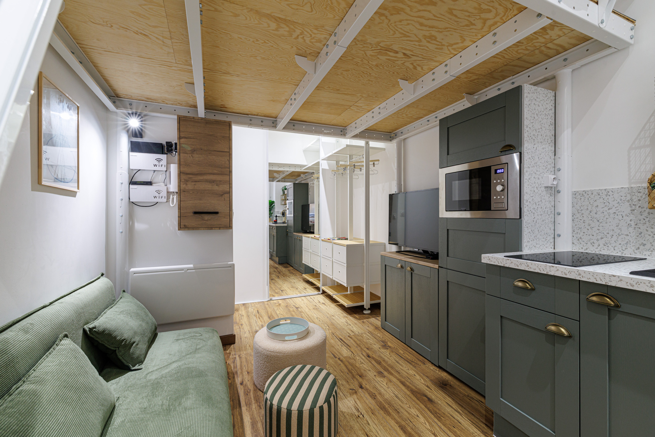 • Une pièce de vie optimisée avec canapé, TV et mobilier sur mesure