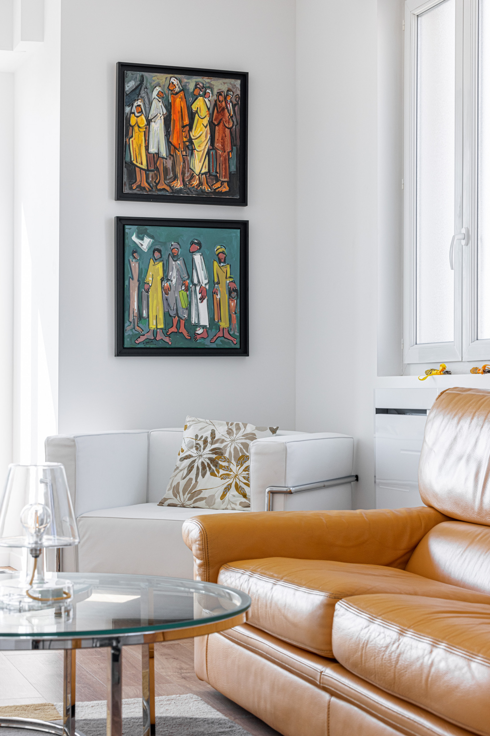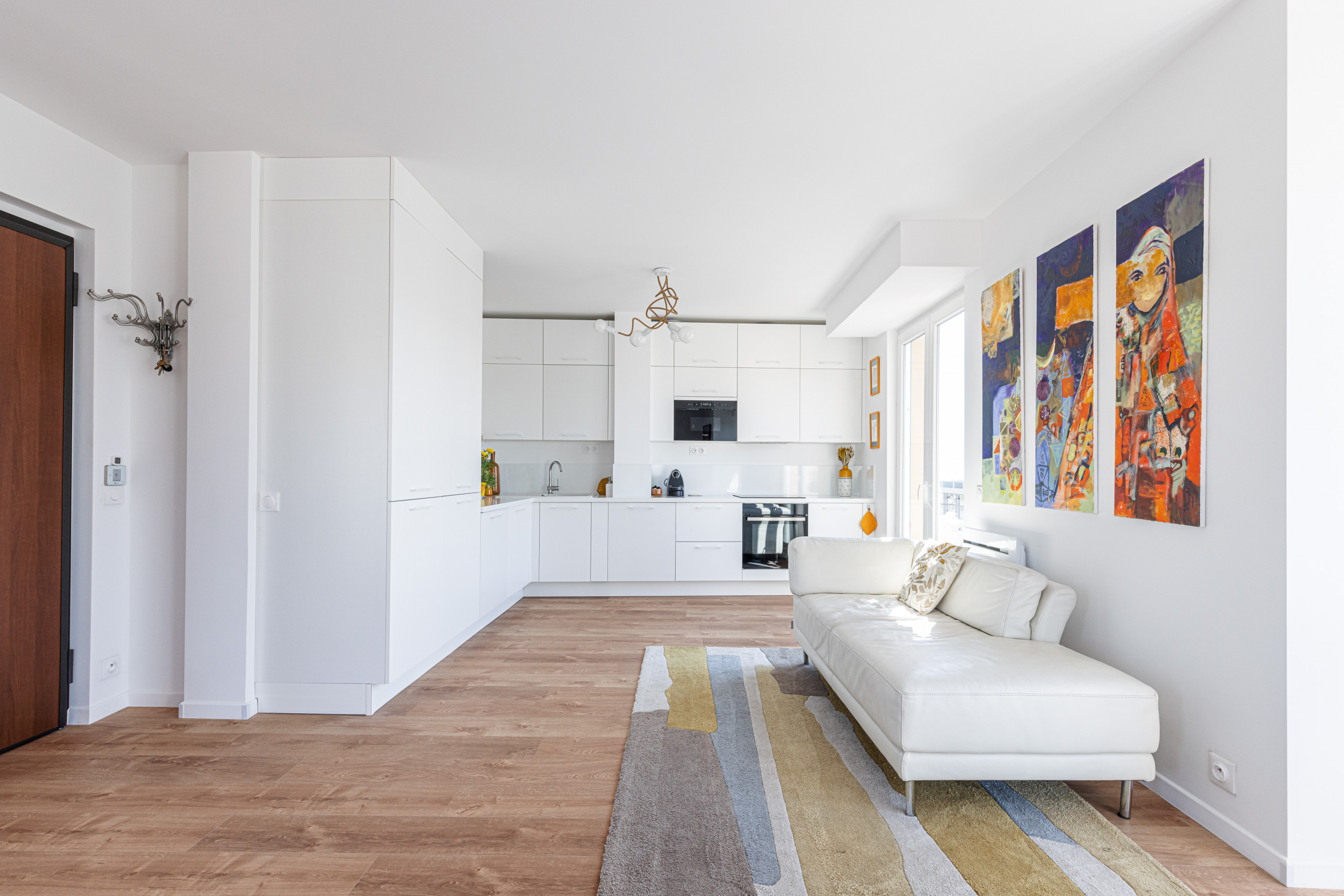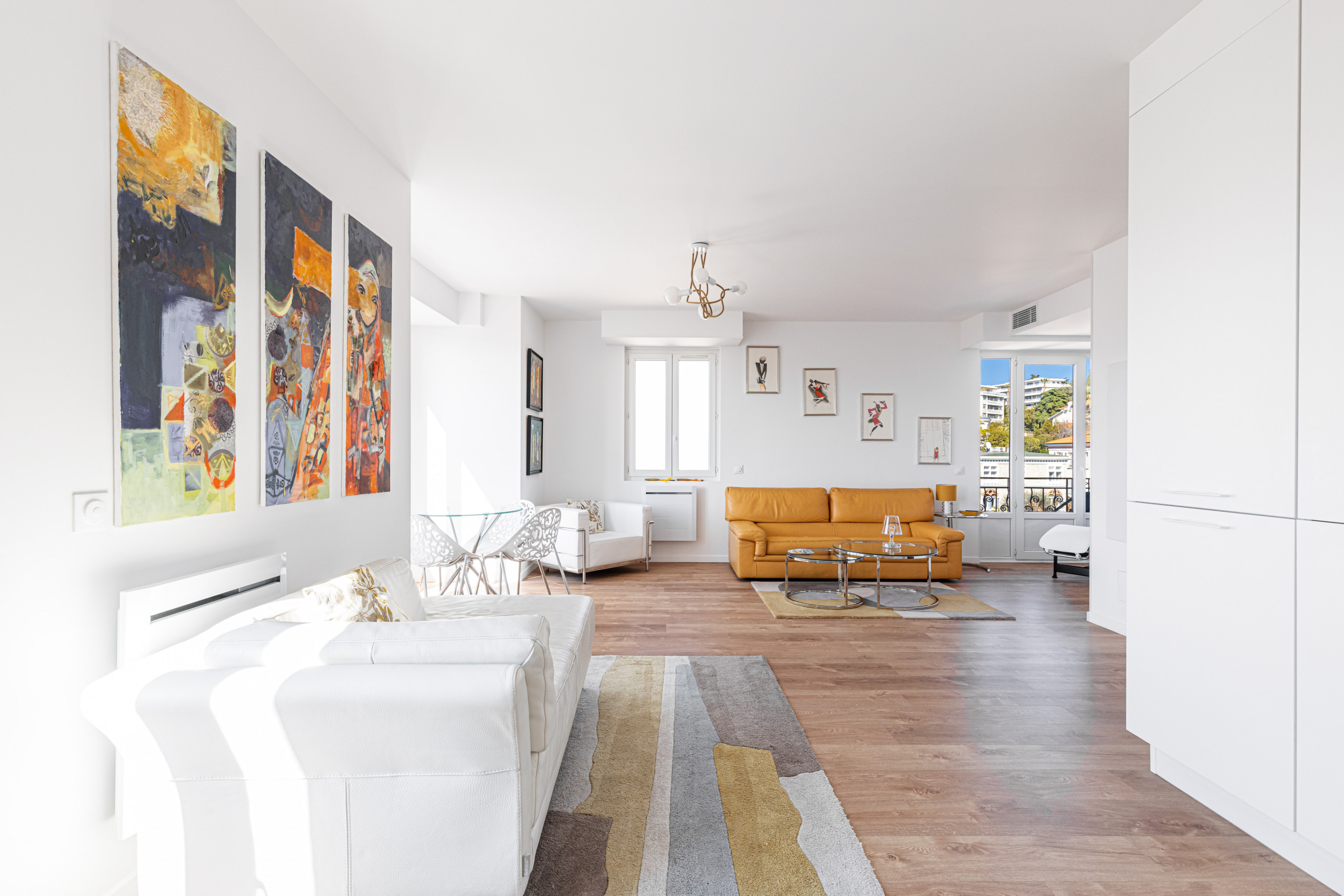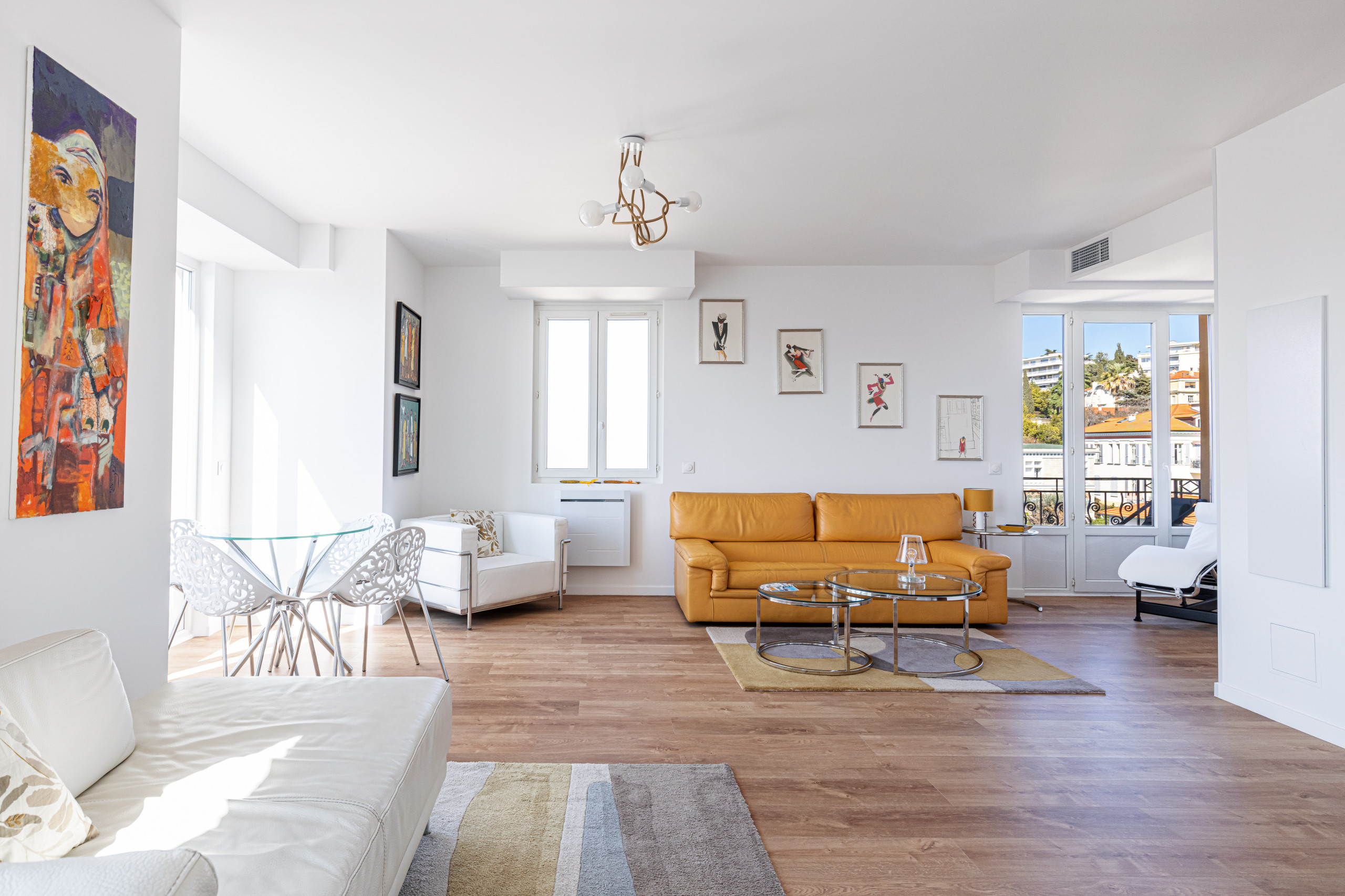 - a large living room with three balconies in double exposure (North and West), one with table and chairs and another with deckchair, two sofas, an armchair and a resting chair, a television with TV box, a dining area nestled in a bow window with dining table