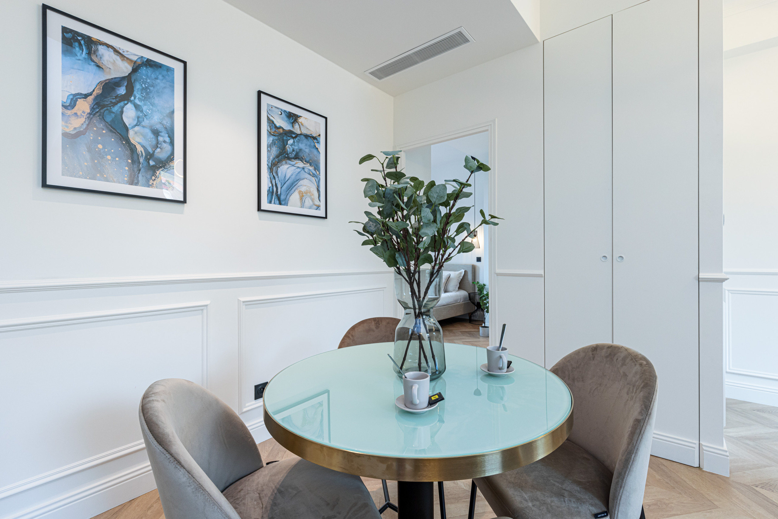 The kitchen is fully equipped: induction hob, microwave oven, extractor hood, dishwasher, kettle, toaster, NESPRESSO coffee maker. A dining area with a small round table and 4 chairs separates the kitchen from the living room.