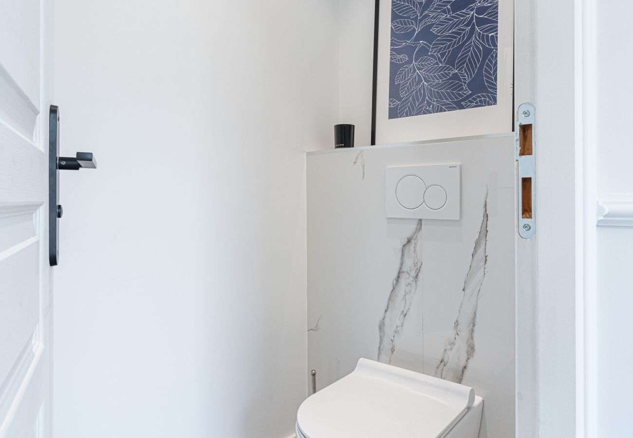 The living room opens onto the balcony with 2 bay windows, it is equipped with a sofa, 2 armchairs, an OLED TV, free WIFI Internet.