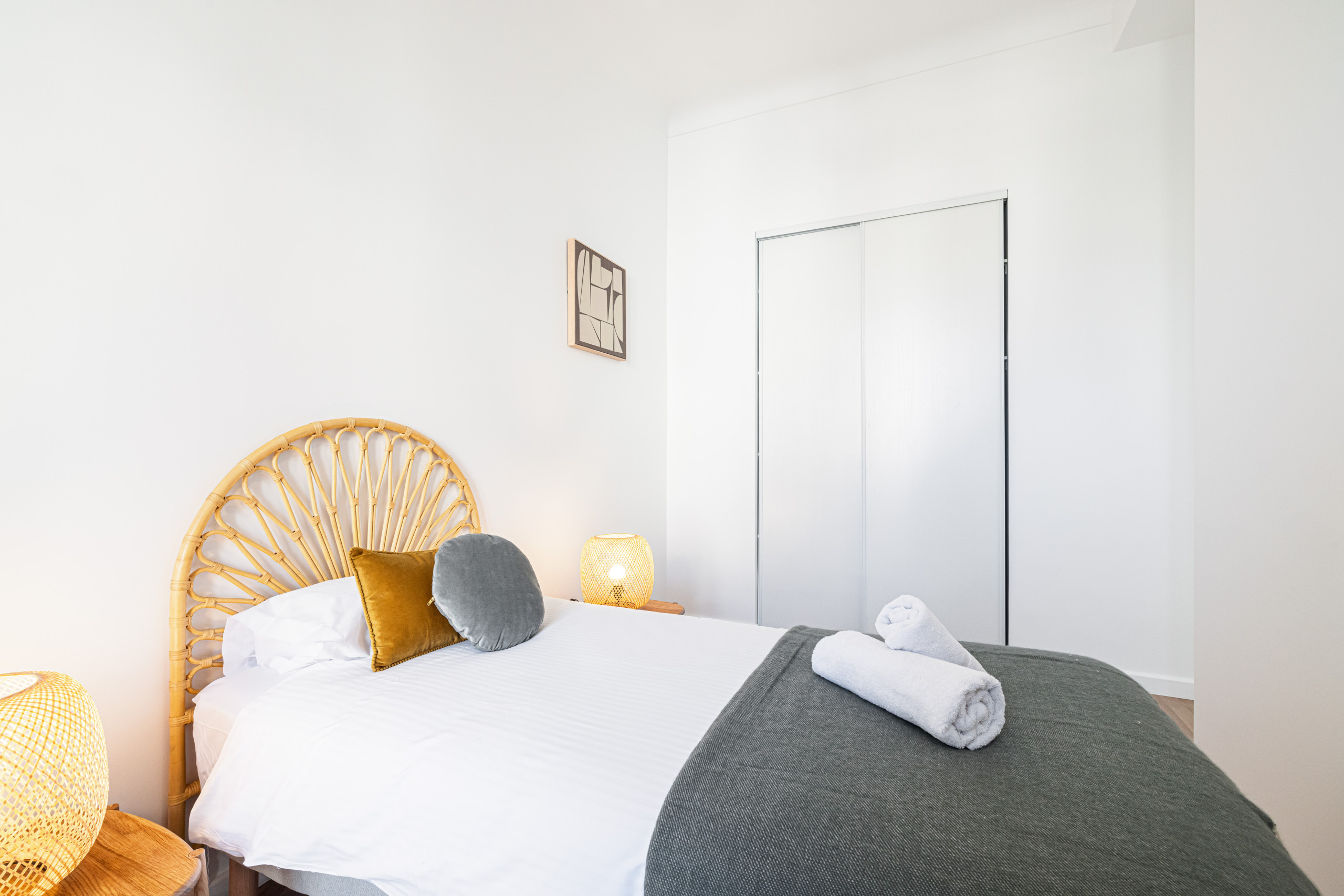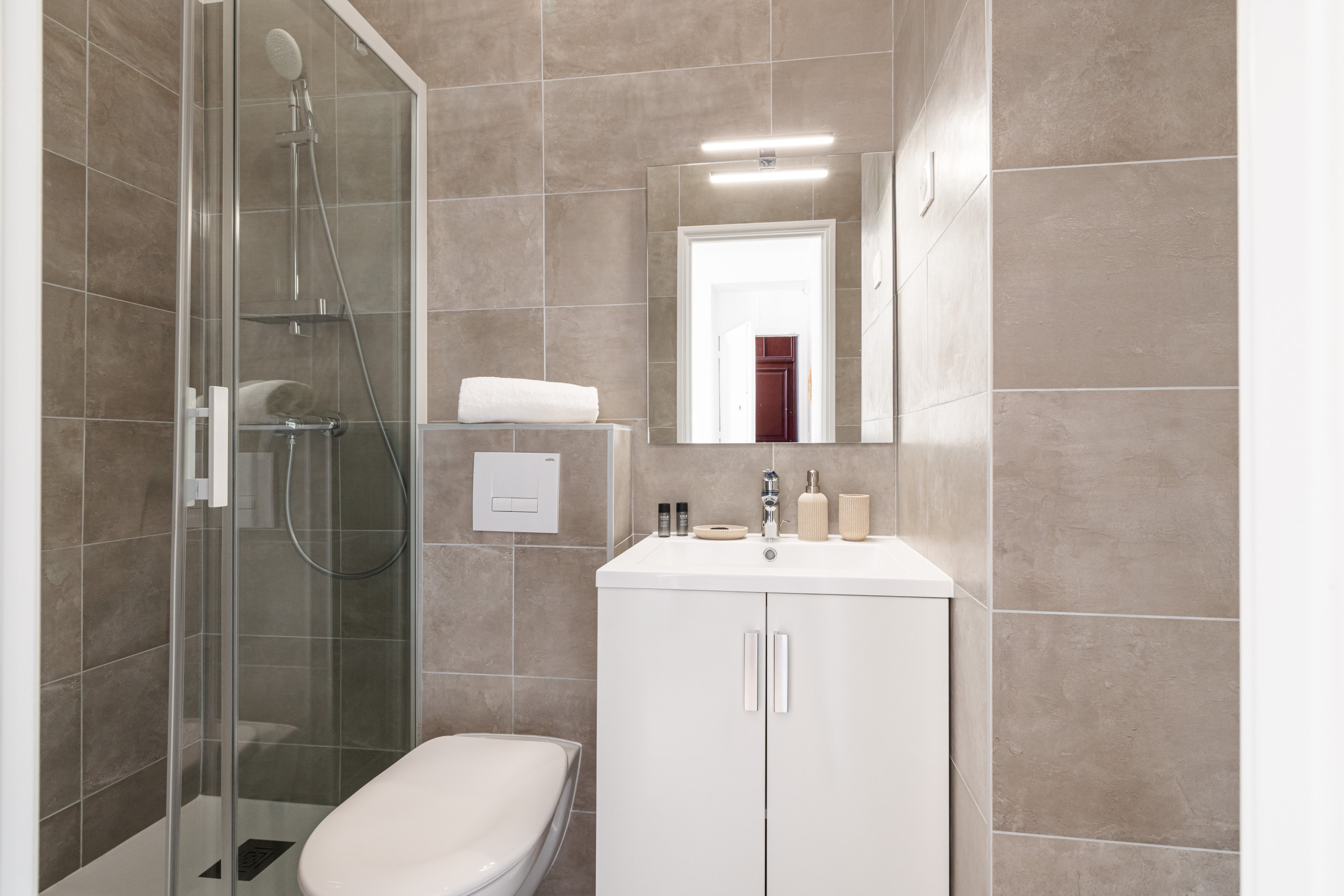 - Upon entering the apartment, you will discover the sleeping area on the right-hand side with three doors leading to the 3 bedrooms: one with a single bed 90x190, the other two are equipped with a standard double bed 140x190. All the bedrooms are equipped with storage (wardrobe/closet) & electric heating. One of them also has an en-suite bathroom with shower & vanity unit.