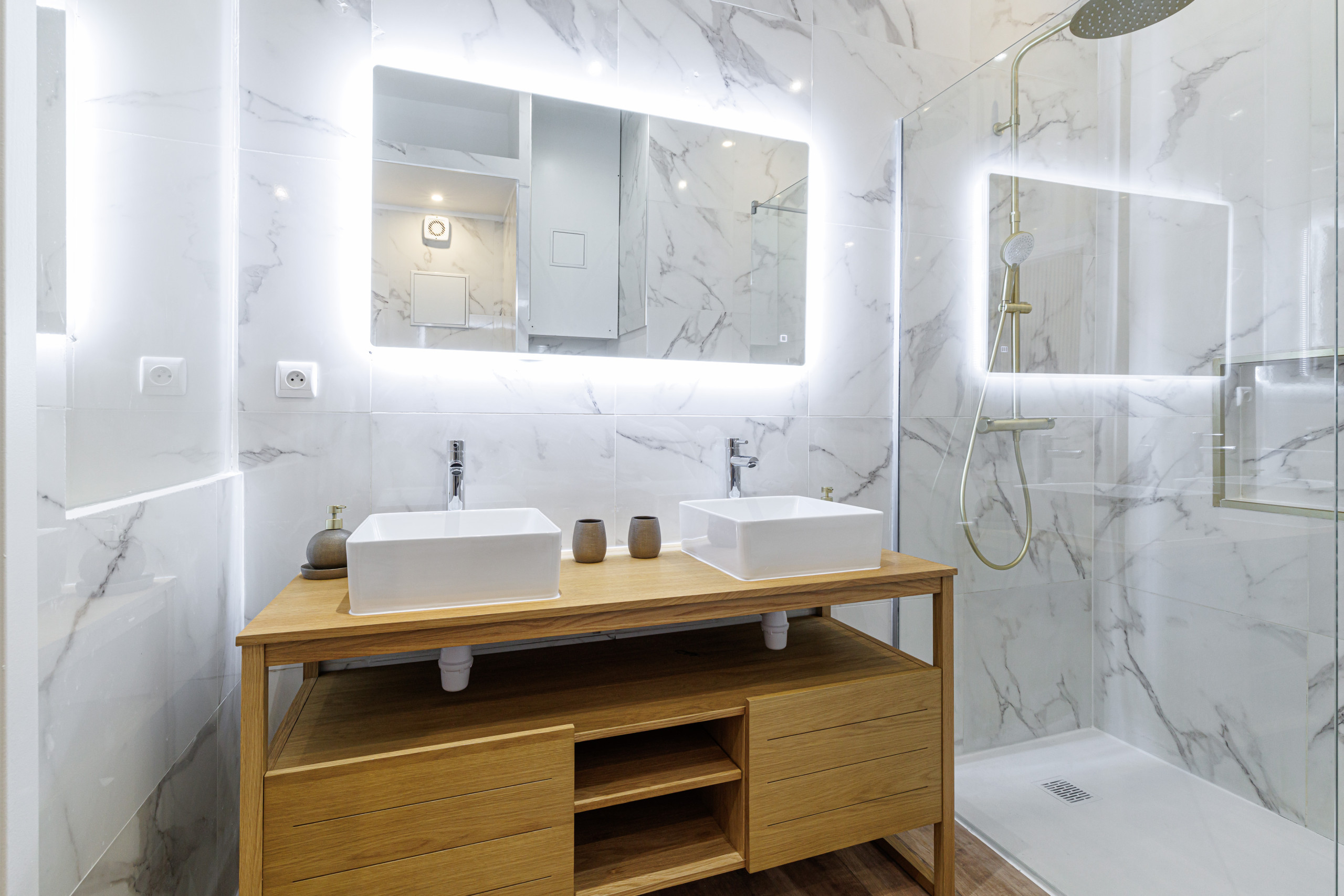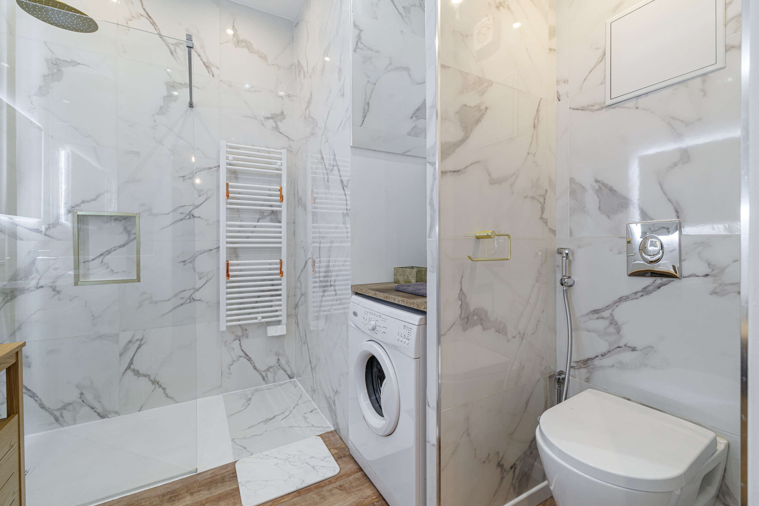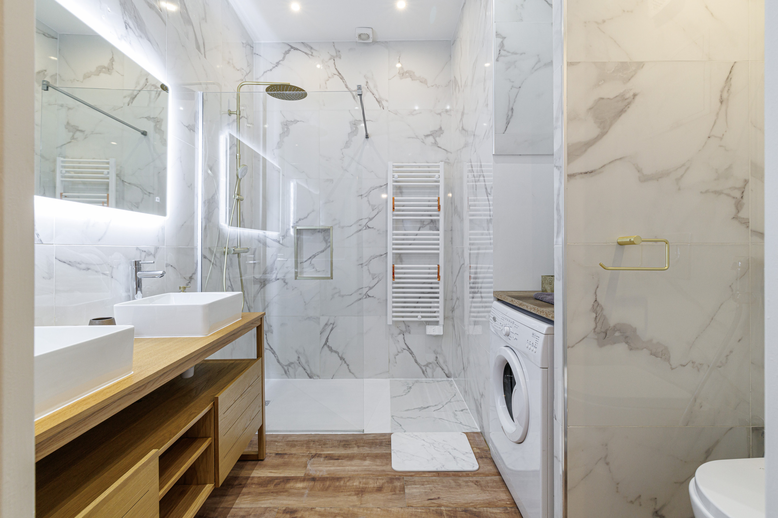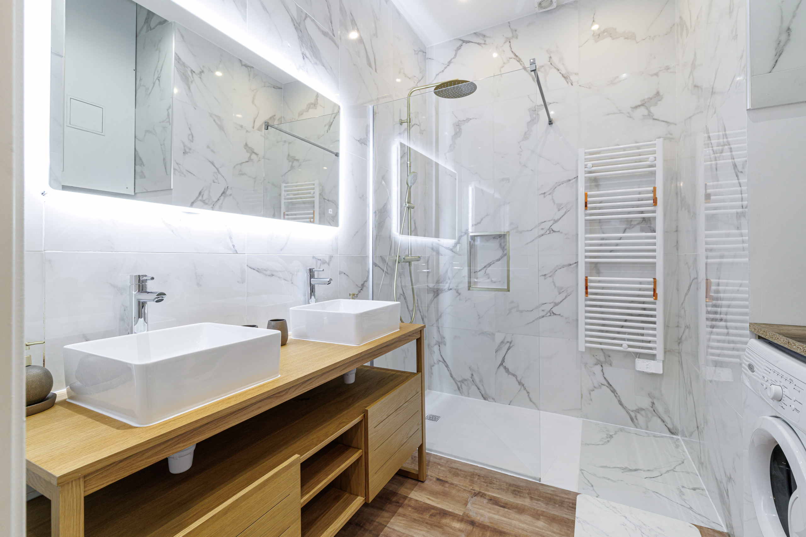 • a modern bathroom with double sink, shower, and washing machine