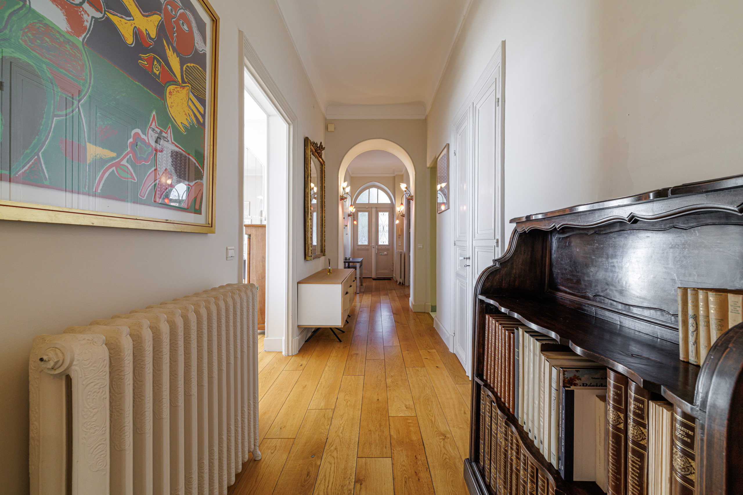 The decoration highlights the villa’s period features: high ceilings, an original metal glass roof, wood paneling, and abundant natural light.