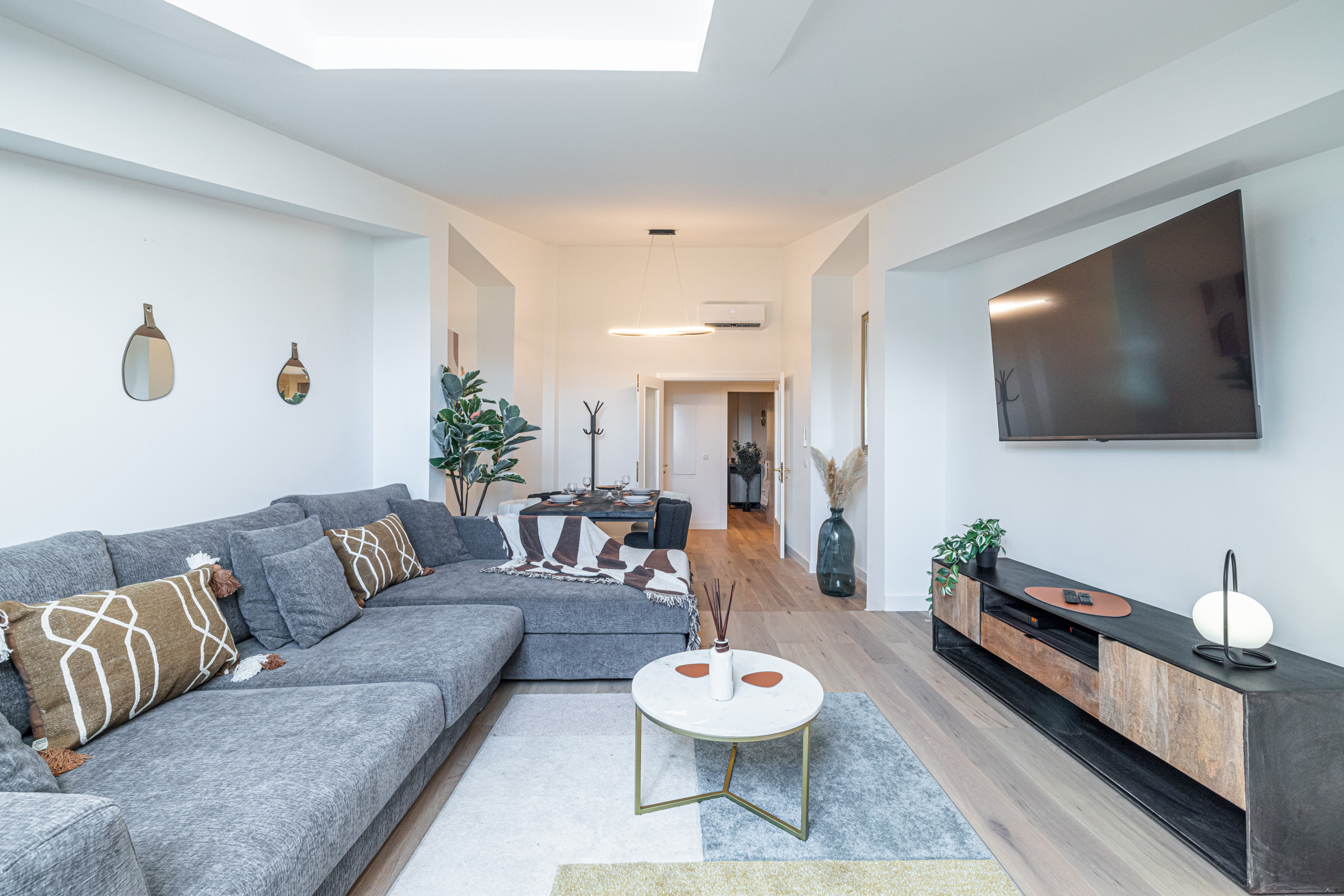 - Then on your right you will discover the large living room with two spaces, a first dining area with table & chairs, then a second living room area raised by a step with a large sofa, armchair, TV, free wifi connection, the small window at this living room level offers you a panoramic view of the Parc de la Coulée Verte & Place Masséna with the Fontaine du Soleil