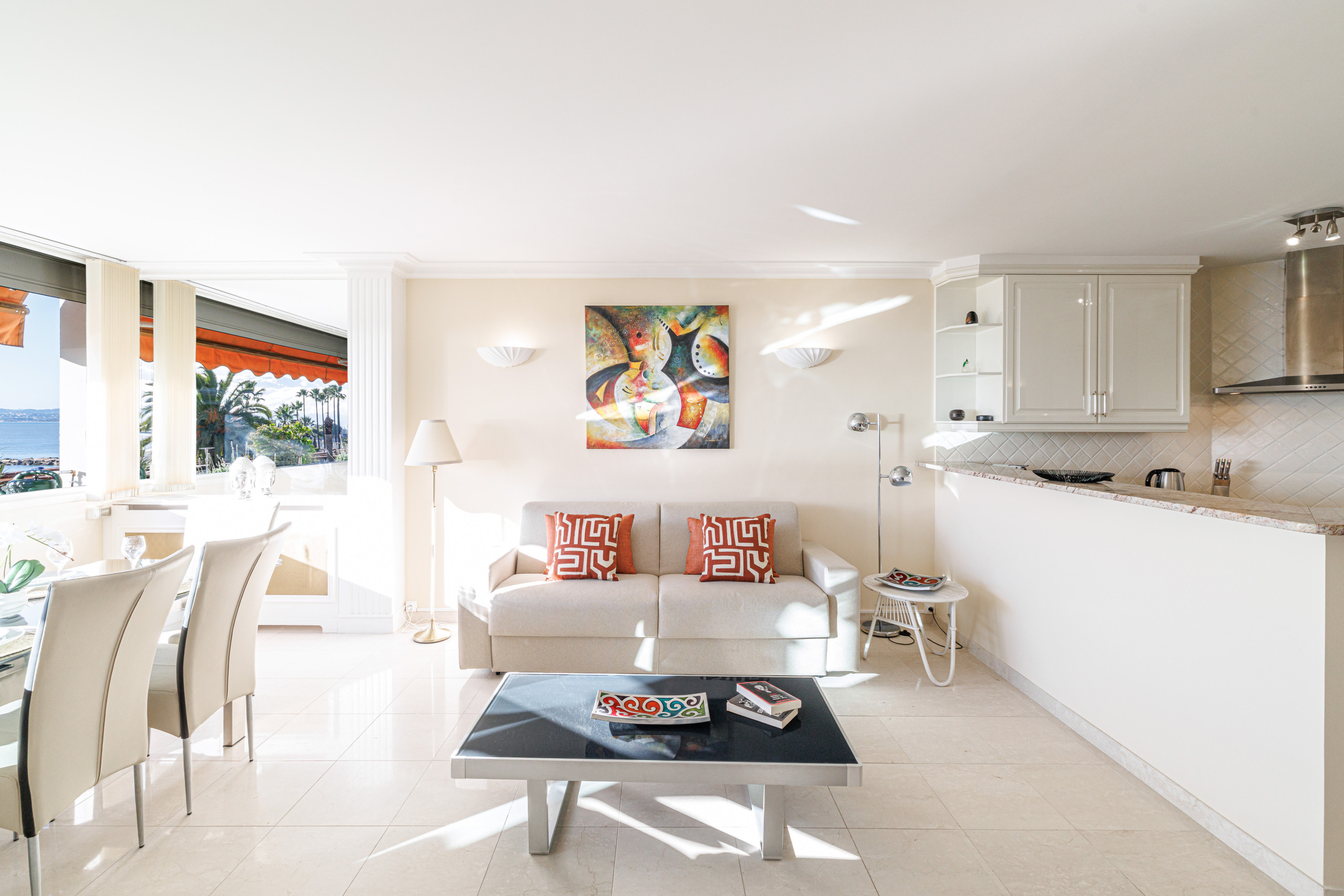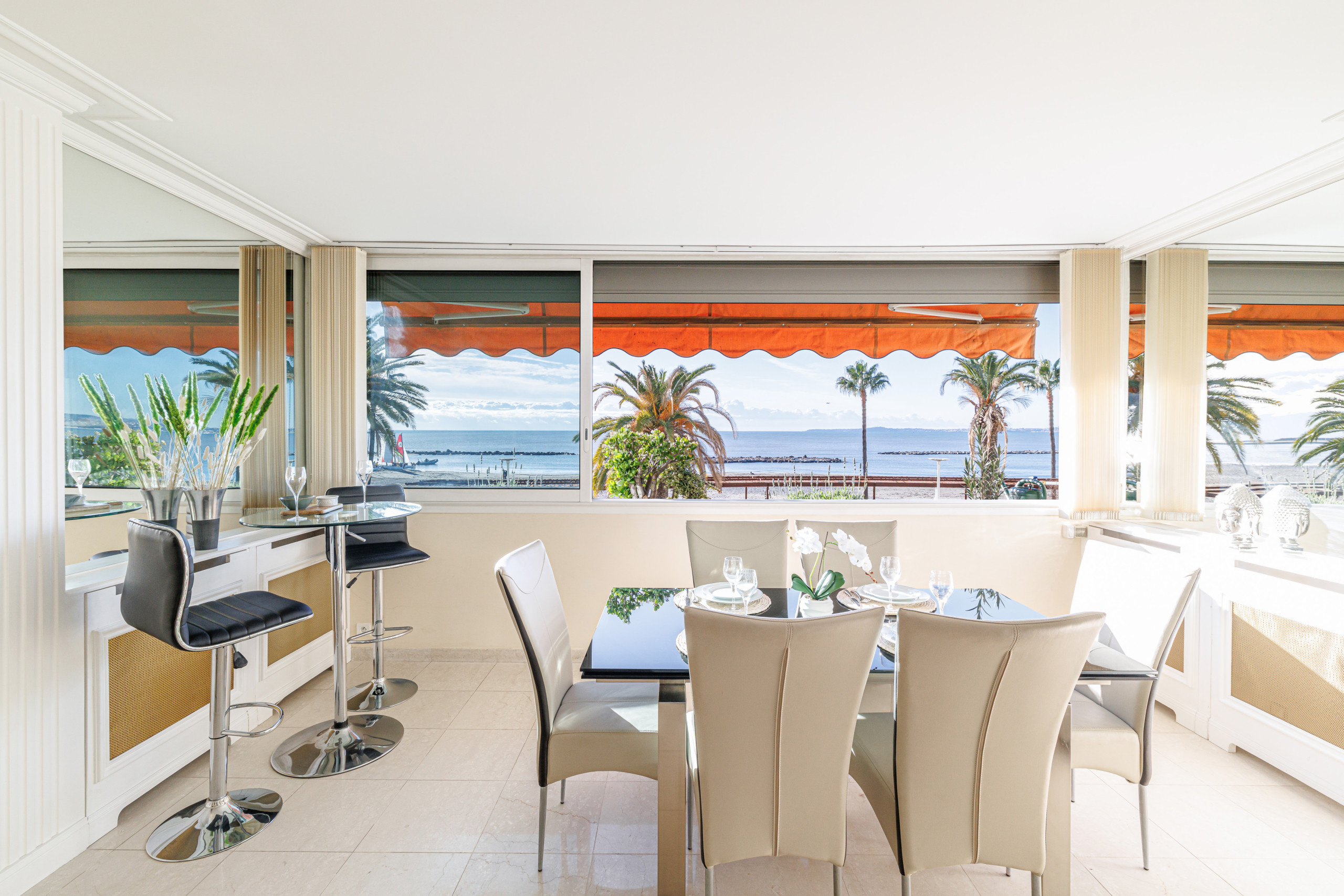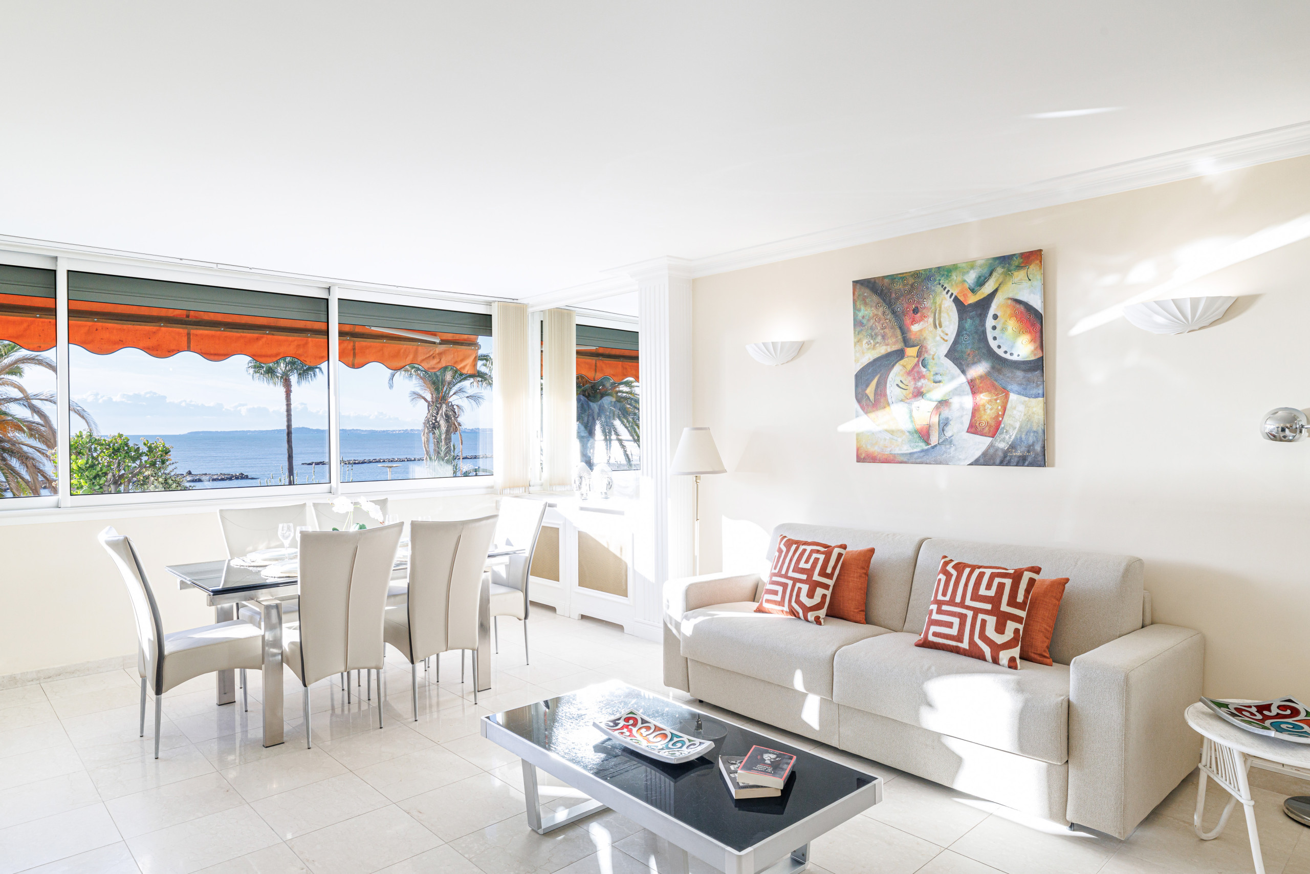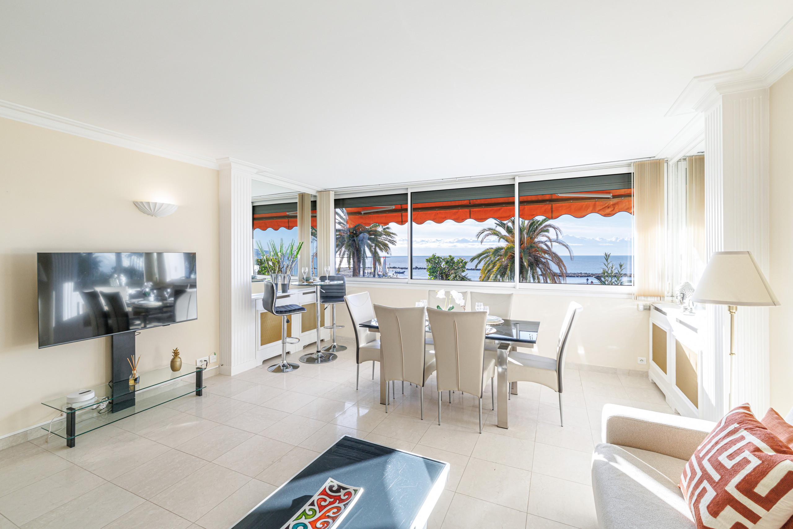 Welcome to this elegant 60 m² one-bedroom apartment, ideally located right on the waterfront, facing the seaside promenade and offering a spectacular panoramic sea view stretching all the way to the Cap d’Antibes.