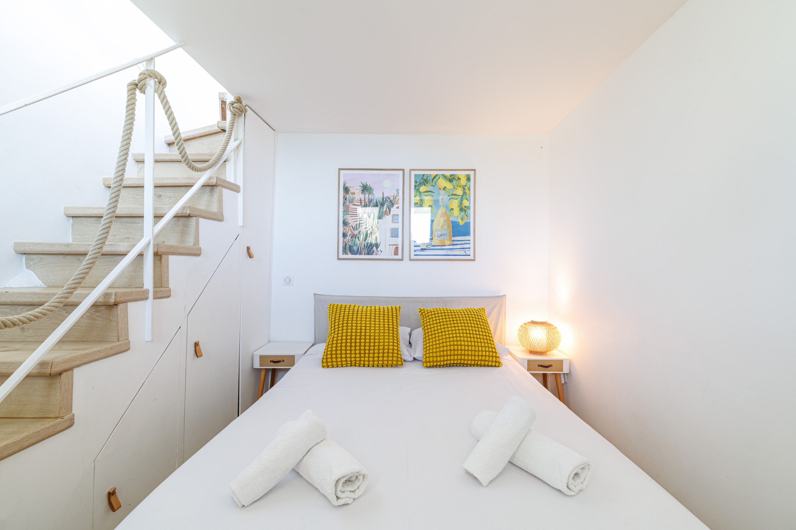 The sleeping area is a duplex, with a real bed (140cm x 200cm), with a memory foam mattress overlay from the French brand BULTEX.
