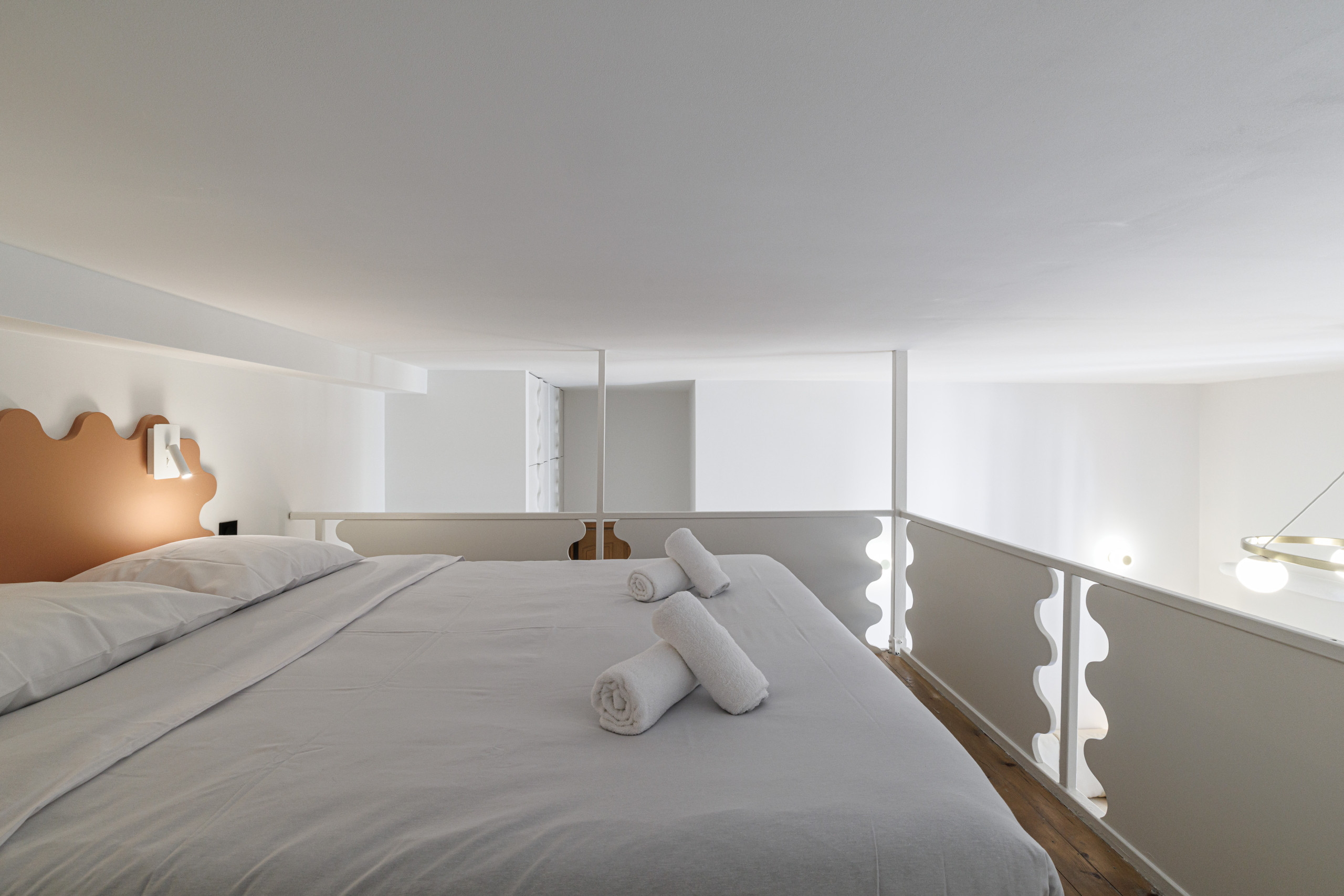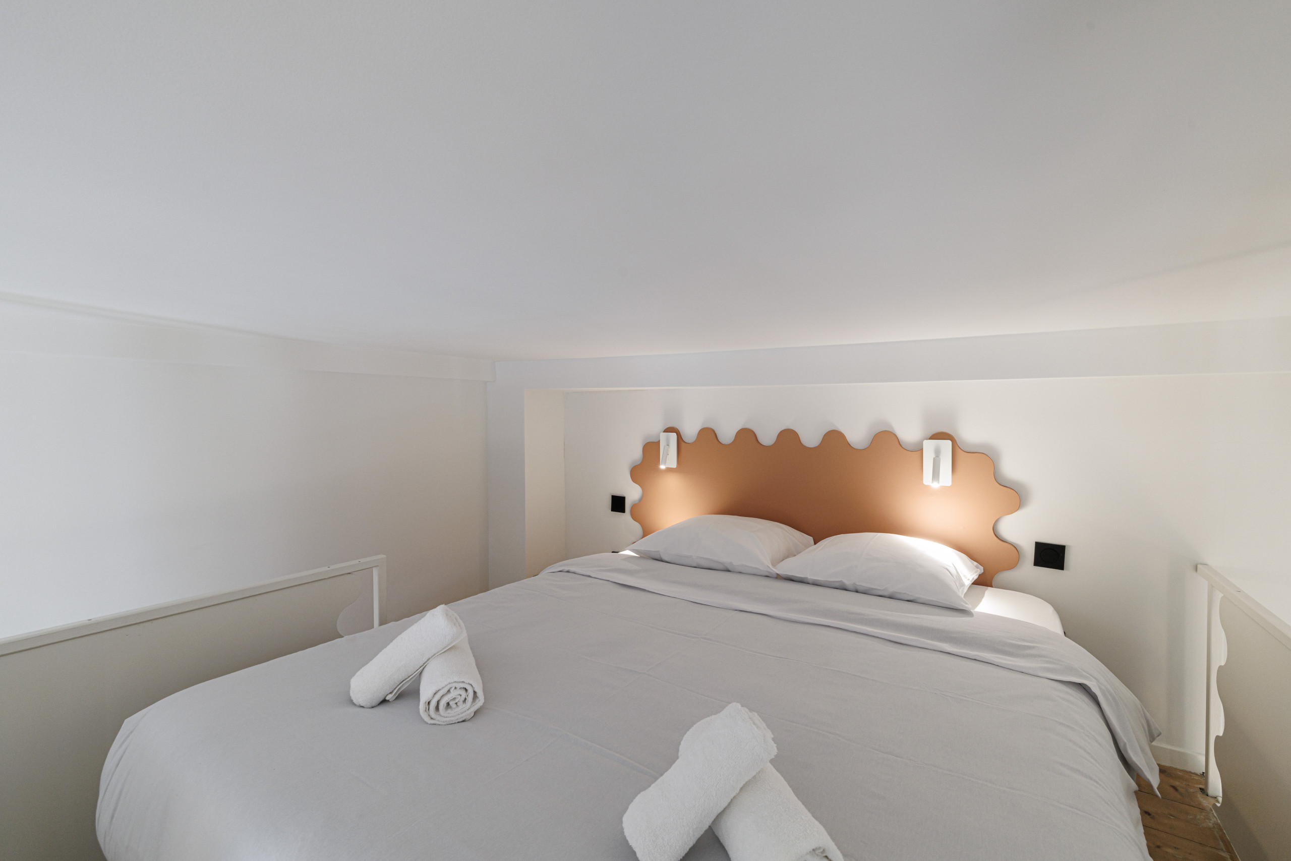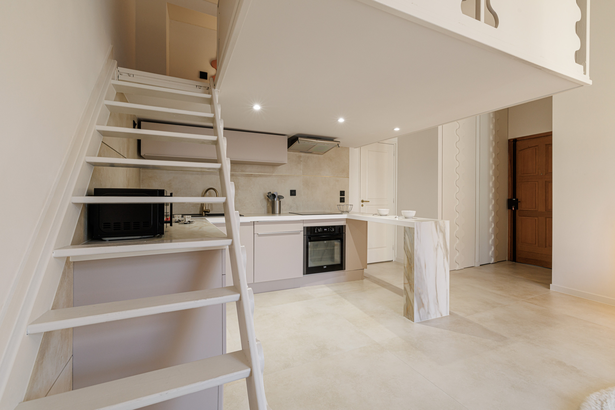 Above the kitchen is a mezzanine hosting the sleeping area, with a 160 cm double bed, offering a cosy space well separated from the living room.